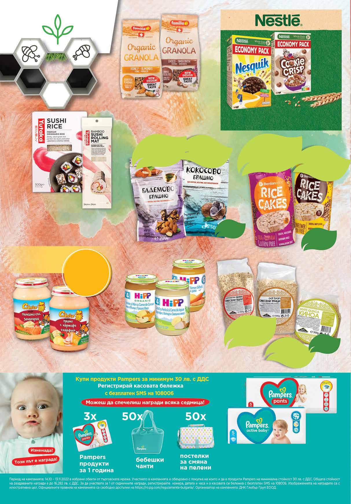 3.69 -13% 3 19 лв|бр 9.79 -21% 7 69 лв|бр 99* лв|бр 38.99 -28% 27 Всички брашна с марка Dr. KESKIN с отстъпка до -37% *предложението е валидно за магазините със сини цени 9.69 -36% 6 19 лв|бр 4.99 -20% 3 99 лв|бр 6.79 -20% 5 39 лв|бр Био пюре ХИП различни видове 190 г Био мюсли и гранола FAMILIA различни видове 375-450 г Избрани пюрета с марка СЛЪНЧО с отстъпка -16% *предложението е валидно за магазините със зелени цени Всички oризови снаксове от 100 г с марка BENLIAN с Овесени ядки, чиа, овесени трици, киноа с марка Бизнес къща с отстъпка отстъпка -21% -20% *предложението е валидно за магазините със сини цени *предложението е валидно за магазините със зелени цени Ориз за суши YUTAKA 500 г Зърнена закуска NESQUIK; COOKIE CRISP Economy Pack 625 г Бамбукова рогозка за навиване на суши Бебешки пелени PAMPERS Maxi Pack 44, 48, 54, 58, 62, 70, 76 бр,различни размери; Бебешки гащички PAMPERS Jumbo Pack 38, 44, 48, 52, 60 бр. различни размери *Цената в валидна от 13.10 до 19.10.2022г. 18 Продуктите се продават в количества, обичайни за едно домакинство. Декорацията към продуктите не е включена в тяхната цена. ТВ „Фантастико“ си запазва правото на промяна в цените.