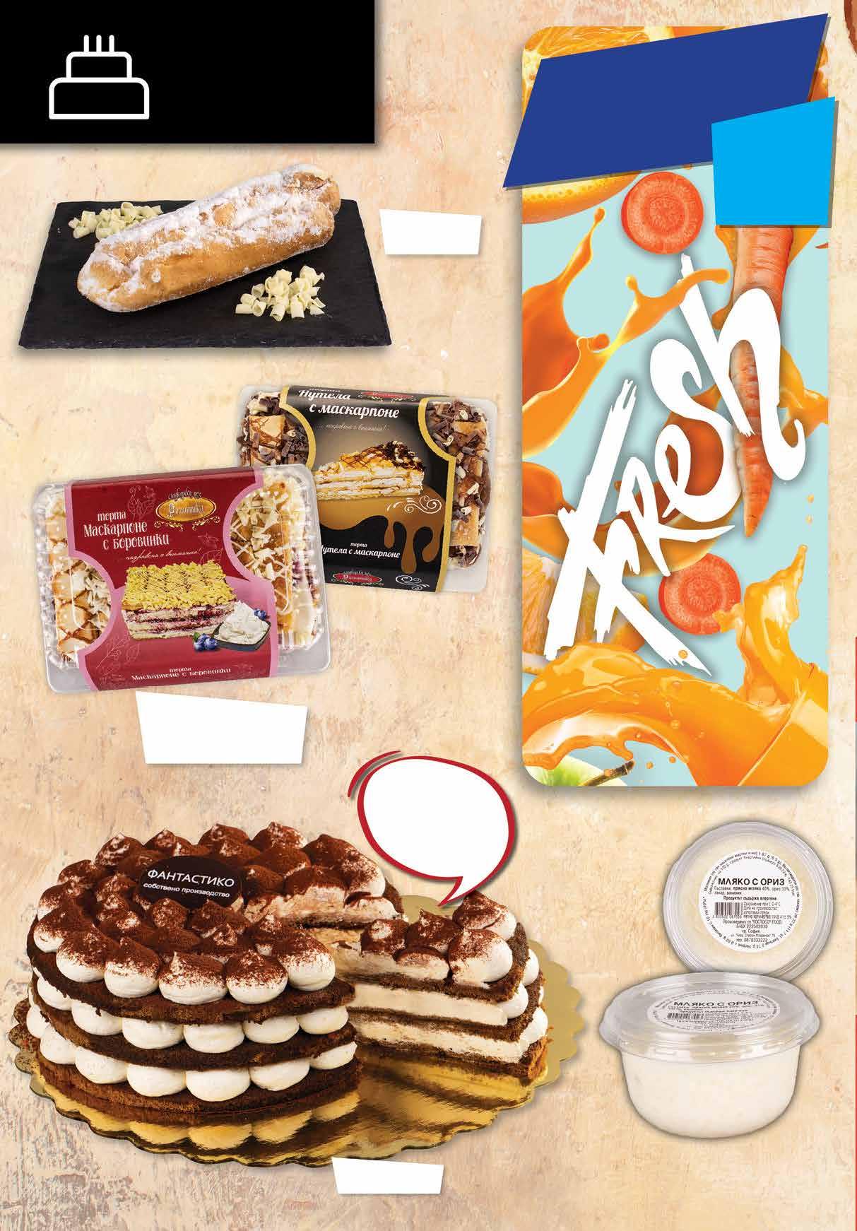 2.99 -23% 2 29 лв|бр 13.39 -32% 8 99 лв|бр 99 лв|бр 17.99 -22% 13 1.59 -44% 0 89 лв|бр Мляко с ориз ГОСТОСО 190 г портокал, ябълка и морков портокал,Фрешябълка и морков с отстъпка -16% *предложението е валидно за магазините със сини цени Торта Тирамису 600 г Торта РОМАНТИКА Нутела с маскарпоне; Маскарпоне с боровинки 500 г Eклер с пудра захар 100 г ЕфиренТирамису крем,съчетан с пухкави блатчета,пандишпанови напоениспревъзходенкафе сироп. 12 Продуктите се продават в количества, обичайни за едно домакинство. Декорацията към продуктите не е включена в тяхната цена. ТВ „Фантастико“ си запазва правото на промяна в цените.