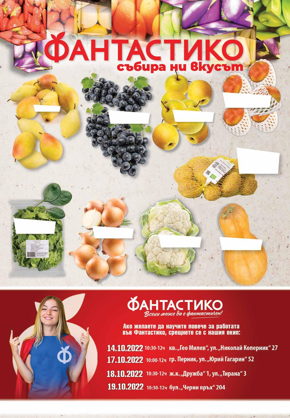 99 лв|кг 33.99 -26% 24 4.69 -25% 3 49 лв|бр 1.89 -26% 1 39 лв|бр 3.49 -28% 2 49 лв|бр 99 лв|кг 22.99 -21% 17 4.59 -23% 3 49 лв|бр 3.19 -21% 2 49 лв|бр 3.99 -17% 3 29 лв|бр 9.99 -30% 6 99 лв|кг Печено пилешко бутчe Печена пържола от свински врат без кост Филе скумрия печено на скара Панирани пилешки бон филенца с корнфлейкс Печено селско кюфте Салата Европейска ОЛИНЕЗА 400 г Млечна салата ФАНТАСТИКО насипна от щандова витрина Салата чушки с чесън Ф ВКУС 400 г Хумус VERNADA Натурален 250 г 11ТВ „Фантастико” не носи отговорност за допуснати печатни грешки. Количествата са лимитирани! Предложенията са валидни до сряда 22.00ч. на 19.10.2022 г.