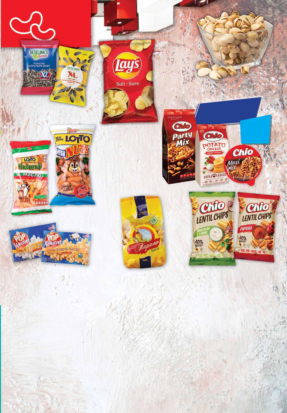 0.85 -23% 0 65 лв|бр NATURALI 1.19 -28% 0 85 лв|бр 2.89 -38% 1 79 лв|бр 99 лв|кг 32.99 -21% 25 1.59 -31% 1 09 лв|бр 140 г 1.19 -33% 0 79 лв|бр 1.39 -21% 1 09 лв|бр 3.09 -38% 1 89 лв|бр 3.19 -25% 2 39 лв|бр Соленки АЕА Тарали различни видове 280 г Слънчоглед ДЕТЕЛИНА XL 100 г; 140 г отстъпка -30% Всички крекери с марка CHIO с *предложението е валидно за магазините със сини цени Чипс LAY`S различни вкусове 140 г Чипс от леща CHIO паприка; сметана и лук 65 г Пуканки за микровълнова POP WEAVER с масло 78 г; със сирене 91 г Снакс LOTTO Mega Nuts; Naturali с масло 60 г Печен ШАМ ФЪСТЪК* насипен *не се предлага във Ф34 19ТВ „Фантастико” не носи отговорност за допуснати печатни грешки. Количествата са лимитирани! Предложенията са валидни до сряда 22.00ч. на 19.10.2022 г. ТАЛОНИ НА “ЛЕТИЩЕ СОФИЯ” ЕАД И ДП “РВД” ЛЕГЕНДА ЦЕНИ: Уважаеми клиенти, обръщайте внимание на цветовото обозначение на цената. Тук може да намерите списък с магазините, разпределени спрямо цвета на цените и наличността на промоциите. ЧЕРВЕНА ЦЕНА: предлагат се в цялата верига ЗЕЛЕНА ЦЕНА: Ф6 район Студентски, бул. Г.М. Димитров №77; Ф7 жк Овча купел 1, ул. Монтевидео №98; Ф11 жк Хаджи Димитър, ул. Васил Кънчев/ул. Баба Вида №29; Ф14 гр. Ботевград, ул. Витоша 1А; Ф15 жк Люлин 1, ул. Тома Георгиев №1; Ф16 жк Люлин 6, бул. Джавахарлал Неру №26А; Ф17 жк Надежда 3, бул. Хан Кубрат №26, до бл. 301; Ф18 жк Стрелбище, ул. Нишава №138; Ф19 кв Бояна, бул. Ал. Пушкин №64; Ф21 жк Младост 4, ул. Д-р Атанас Москов №15; Ф22 Студентски град, ул. Акад. Борис Стефанов №22; Ф23 жк Надежда 2, ул. Свети Никола Нови №14; Ф27 жк Надежда 1, ул. Й. Лютибродски/ ул. Царевец до бл.118; Ф28 жк Гео Милев, ул. Коста Лулчев №52; Ф29 гр. Кюстендил, ул. Цар Освободител №231; Ф32 жк Младост 3, ул. 102, срещу бл. 321; Ф34 жк Хаджи Димитър, ул. Макгахан №81; Ф35 жк Дружба 2, бул. Проф. Цветан Лазаров №140; Ф36 жк Дървеница, бул. Св. Климент Охридски №15; Ф38 жк Овча купел, ул. Любляна №42А; Ф39 жк Разсадника – Коньовица, ул. Хъшове №4; Ф40 жк Гео Милев, ул. Николай Коперник №27;Ф41 гр. Елин Пелин, ул. Витоша №7; Ф42 жк Младост 1, бул. Йерусалим №22; Ф43 кв. Манастирски ливади, ул. Пирин №51А; Ф44 гр. Банкя, кв. Изгрев, ул. Стефан Стамболов №138; Ф45 гр. Перник, ж.к. Изток, ул. Юрий Гагарин №52. СИНЯ ЦЕНА: Ф6 район Студентски, бул. Г.М. Димитров №77; Ф12 жк Младост 4, ул. “Александър Паскалев” №3; Ф14 гр. Ботевград, ул. Витоша 1А; Ф15 жк Люлин 1, ул. Тома Георгиев №1; Ф16 жк Люлин 6, бул. Джавахарлал Неру №26А; Ф17 жк Надежда 3, бул. Хан Кубрат №26, до бл. 301; Ф22 Студентски град, ул. Акад. Борис Стефанов №22; Ф28 жк Гео Милев, ул. Коста Лулчев №52; Ф30 кв Драгалевци, бул. Черни връх №204; Ф34 жк Хаджи Димитър, ул. Макгахан №81; Ф36 жк Дървеница, бул. Св. Климент Охридски №15; Ф38 жк Овча купел, ул. Любляна №42А; Ф40 жк Гео Милев, ул. Николай Коперник №27; Ф42 жк Младост 1, бул. Йерусалим №22; Ф44 гр. Банкя, кв. Изгрев, ул. Стефан Стамболов №138; Ф45 гр. Перник, ж.к. Изток, ул. Юрий Гагарин №52. Във всички обекти на верига Фантастико можете да заплатите със следните карти и ваучери: РАБОТНО ВРЕМЕ: *от 7.30 до 22.00 ч. Ф1 ул. Оборище №72; Ф2 жк Красно село, ул. Хубча №2; Ф3 бул. Мадрид №8; Ф4 жк Западен парк, ул. Суходолска №2; Ф5 бул. Цариградско шосе №56; Ф7 жк Овча купел 1, ул. Монтевидео №98; Ф8 жк Лозенец, бул. Черни връх №20; Ф9 Спирка Оряхово, бул. Сливница №65; Ф10 жк Борово, ул. Ген. Стефан Тошев, бл.223; Ф11 жк Хаджи Димитър, ул. Васил Кънчев/ул. Баба Вида; Ф12 жк Младост 4, ул. “Александър Паскалев” №3; Ф14 гр. Ботевград, ул. Витоша 1А; Ф15 жк Люлин 1, ул. Тома Георгиев №1; Ф16 жк Люлин 6, бул. Джавахарлал Неру №26А; Ф17 жк Надежда 3, бул. Хан Кубр