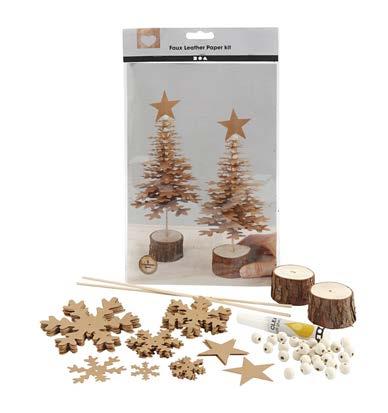2 x 16 хартиени снежинки с кожен ефект, 4 звезди, 34 дървени мъниста, 2 дървени крака със съответстващи пръчки, лепило.