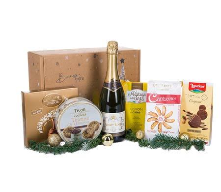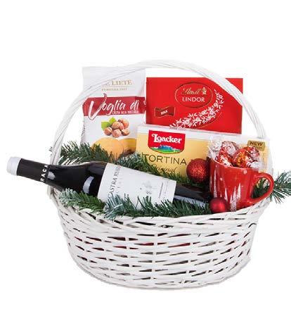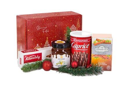 Червено вино „Castra Rubra Merlot & Malbec“ - 1 бр; • Италиански кейк „La bottega della Torta“, 400 g -1 бр; • Кантучини „ORE LIETE“, 180 g - 1 брой; • Шоколадови бонбони Lindt, 100 g. – 1 бр; • Чай Ahmad, 40 g – 1 бр; • Турон El Almendro, 75 g - 1 бр; • Коледна украса - клончета и топки.