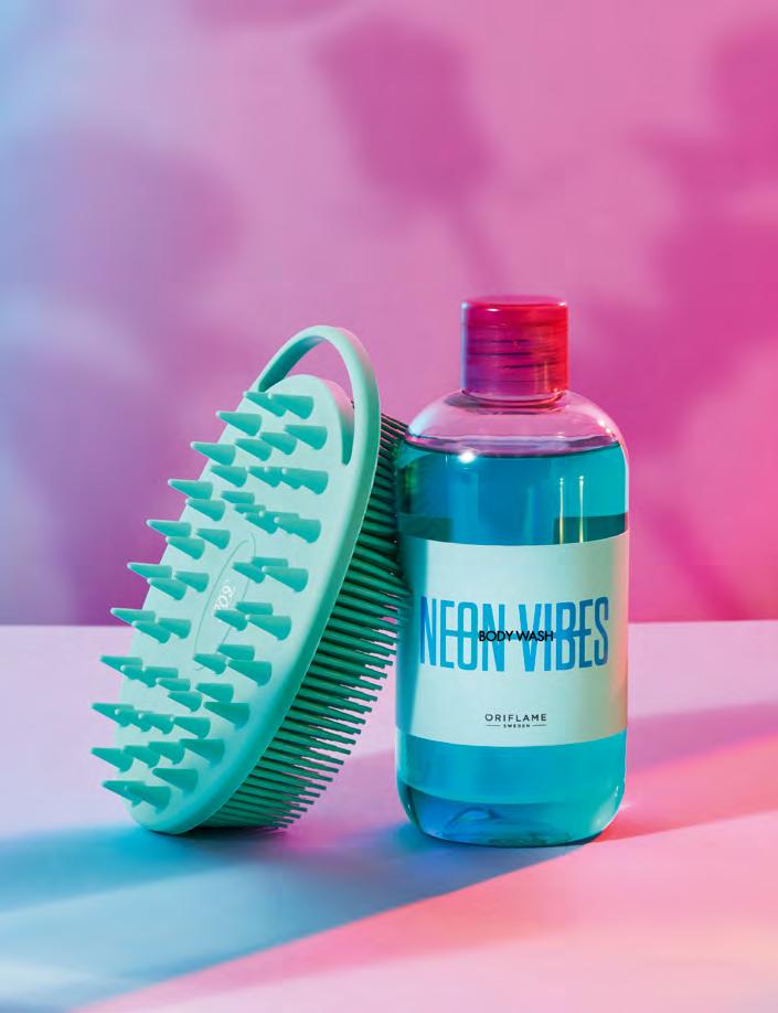МАСАЖ и БЛЯСЪК! МАСАЖОР ЗА ТЯЛО САМО 6.99 лв. ПРИ ПОКУПКА НА ПРОДУКТ ОТ СТР. 154-155 Гел за душ Neon Vibes 250 мл 46620 12.00 лв. 6.99 лв. Четка за тяло и масажор Материали: Силикон. Размер: 13,3 x 7,8 x 4,2 см. 47431 8.99 лв. Силикон без латекс Великолепно усещане за кожата Едната страна е с нежни власинки за ексфолииране на кожата за повече мекота и гладкост. От другата страна има масажиращи зъбци за премахване на напрежението в мускулите. бутилка от 50% рециклирана пластмаса Формулиран като биоразградим, без парабени и дерматологично тестван Преобразете моментите на грижа за себе си и преживяванията си под душа. Б анята ви е вашата собствена светла площадка за игра. Заобиколете се с еуфорична жизненост. Събудете сетивата си и освободете енергията си. НОВА ЛИМИТИРАНА КОЛЕКЦИЯ МОИТЕ ЛЕТНИ ПРИЯТЕЛИ 155