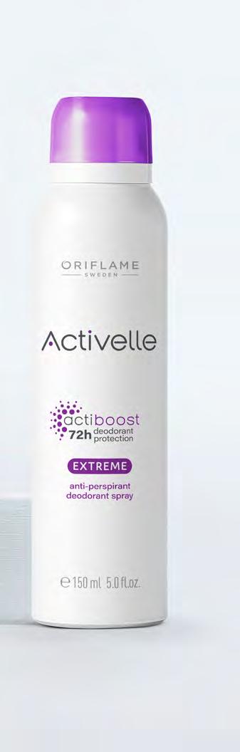 125 Рол-он против изпотяване Activelle Extreme 50 мл 33142 7.00 лв. 3.99 лв. Рон-он против изпотяване Activelle Invisible Fresh 50 мл 41303 7.00 лв. 3.99 лв. * Самооценка от 71 жени, които се изпотяват обилно 81% се чувстват защитени при екстремни условия* †Клинично доказано * Тествано от потребители. Енергизиращ цитрусов аромат Максимална защита дори след физическа активност* ДО 72ч† Спрей дезодорант против изпотяване Activelle Extreme 150 мл 33147 12.00 лв. 6.99 лв. С флоралноцитрусов аромат. Помага ви да сте свежи и не оставя петна!