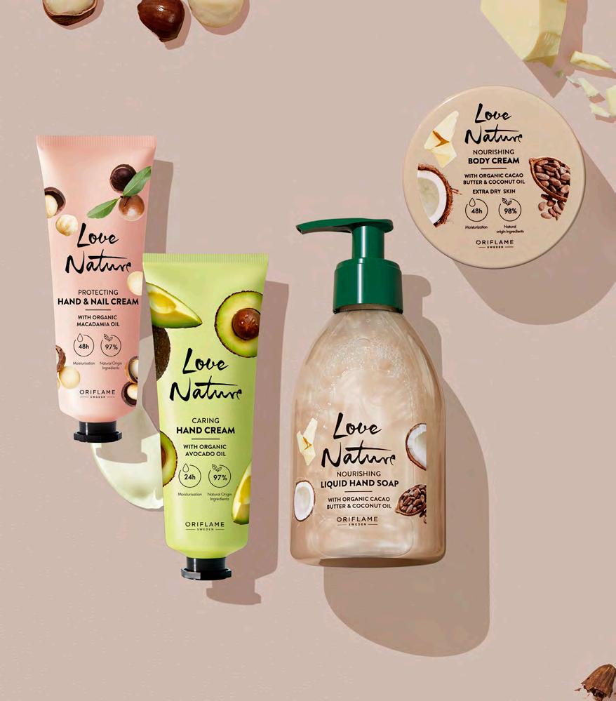 43954 43956 41264 41488 Natural Origin Ingredients 109 Подхранващ течен сапун с органични екстракти от какаово масло & кокосово масло Love Nature 300 мл 43111 11.00 лв. 6.99 лв. Подхранващ крем за тяло с органично какаово & кокосово масло Love Nature 200 мл 42991 16.00 лв. 8.99 лв. Хидратиращ крем за ръце Love Nature с органично масло от авокадо 75 мл 44280 8.00 лв. 3.49 лв. Защитен крем за ръце и нокти Love Nature с органично масло от макадамия 75 мл 41335 8.00 лв. 3.99 лв. Гъба за душ Love Nature Размери: 12 x 11 cм Материали: 100% рециклирана полиетиленова пластмаса. 45079 2.99 лв. 2.49 лв. КРЕМ ЗА ТЯЛО Богата, подходяща за изключително суха кожа формула с 98% съставки с естествен произход, която осигурява 48-часова хидратация ∆ . ТЕЧЕН САПУН ЗА РЪЦЕ ЛИМИТИРАНА КОЛЕКЦИЯ Съставки с естествен произход Лека, хидратираща формула, която поддържа кожната бариера КРЕМ С МАСЛО ОТ МАКАДАМИЯ Помага за предпазване на ръцете и ноктите от студа Създадени с даровете на природата ∆Клинично тестван КРЕМ С МАСЛО ОТ АВОКАДО С биоразградима, pH-балансирана формула, която почиства и хидратира кожата.