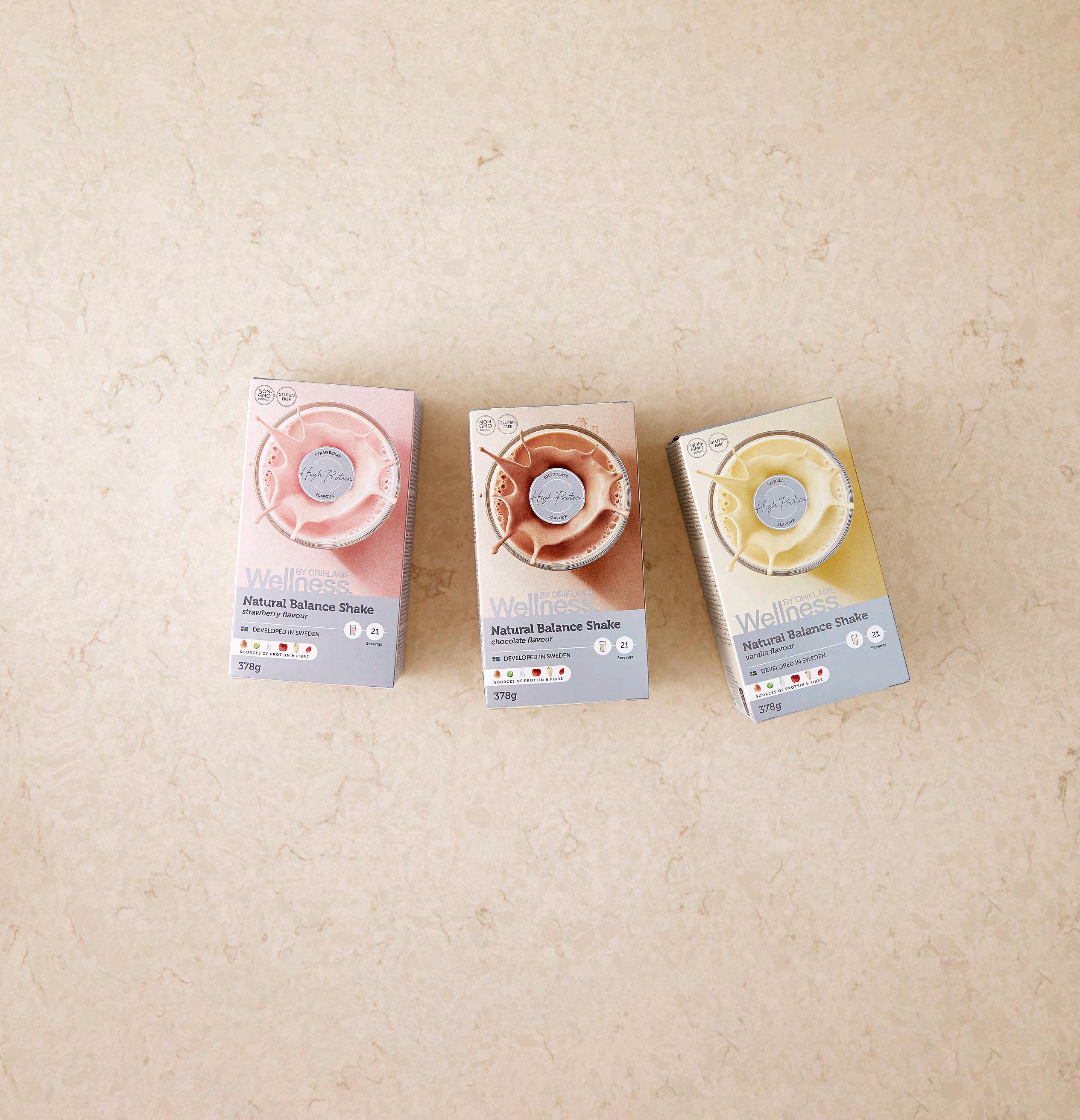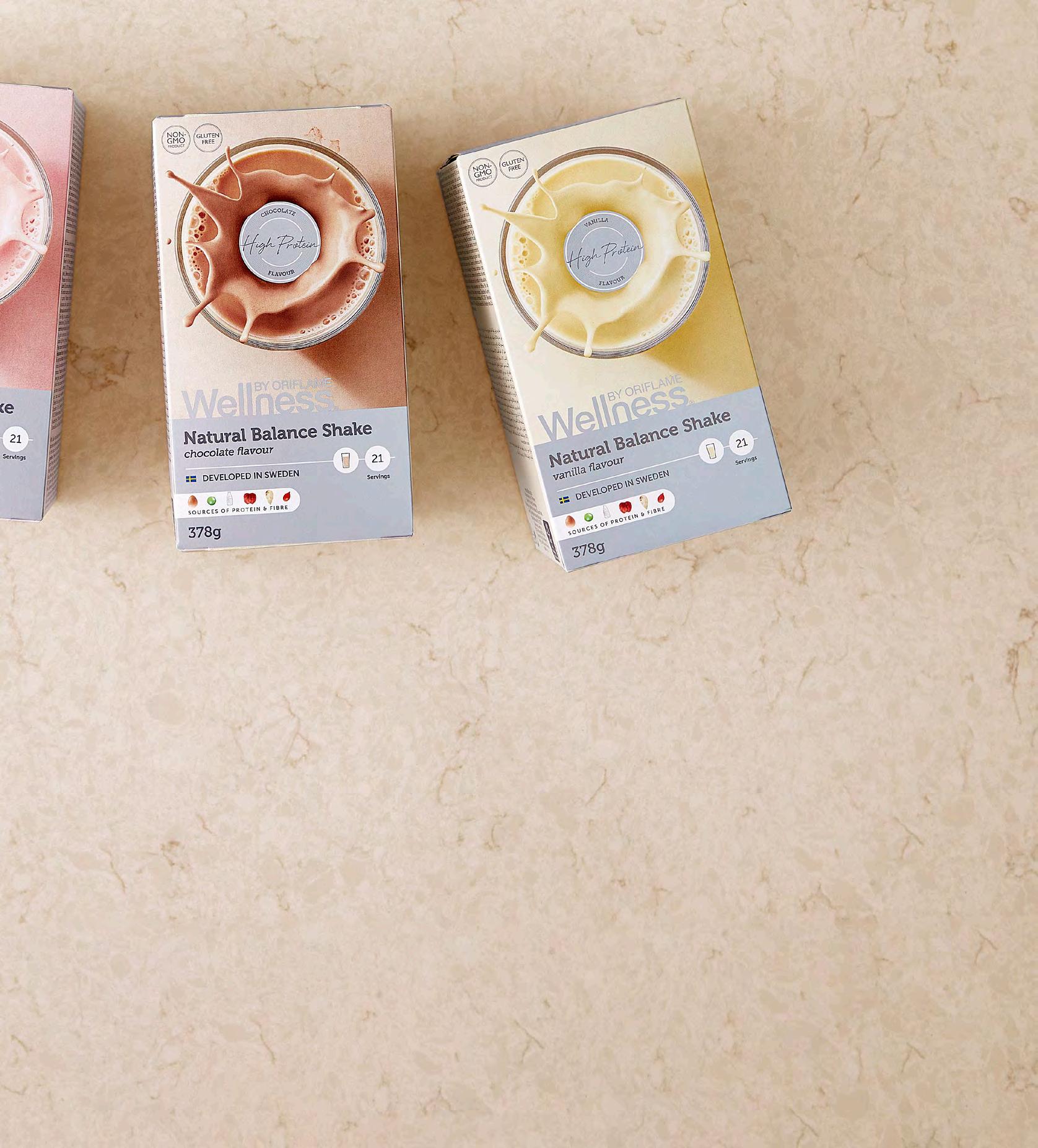 54 Шейкър Wellness Материали: PE, PP, неръждаема стомана. Без BPA. Размери: 220 x 95 мм. 600 мл 45381 18.00 лв. Луксозна кутия 14.5 x 11 см 27728 32.90 лв. Шейкър Wellness Smartshake Размери: 220 х 95 мм, 600 мл Материал: PP (бутилка) и PE (капак), неръждаема стомана (щипка) 44622 21.99 лв. *Стойностите леко варират в зависимост от вкуса. Вижте опаковката за подробна информация за съдържанието. 29689 Шейк „Естествен баланс“ с ягодов вкус 21 порции. 378 g. 68.90 лв. 29691 Шейк „Естествен баланс“ с шоколадов вкус 21 порции. 378g. 68.90 лв. 29690 Шейк „Естествен баланс“ с ванилов вкус 21 порции. 378 g. 68.90 лв. *Купете в 2 последователни каталога и вземете като ПОДАРЪК в 3-тия. Попитайте вашия Орифлейм партньор за абонаментна програма Wellness. Всеки 3-ти шейк ПОДАРЪК* 21 ПОРЦИИ ПРОДУКТ БЕЗ ГМО БЕЗ ГЛУТЕН Удобно и вкусно, за да сте здрави! Шейковете „Естествен баланс“ са създадени, за да можете да хапнете през деня или да се заредите с енергия преди или след тренировка. Всяка порция съдържа*: Енергия: 70 – 71 калории Протеин: 6.7 – 7.1 гр Хранителни фибри: 1.6 – 1.8 гр Основин аминокиселини: приблизително 3 гр
