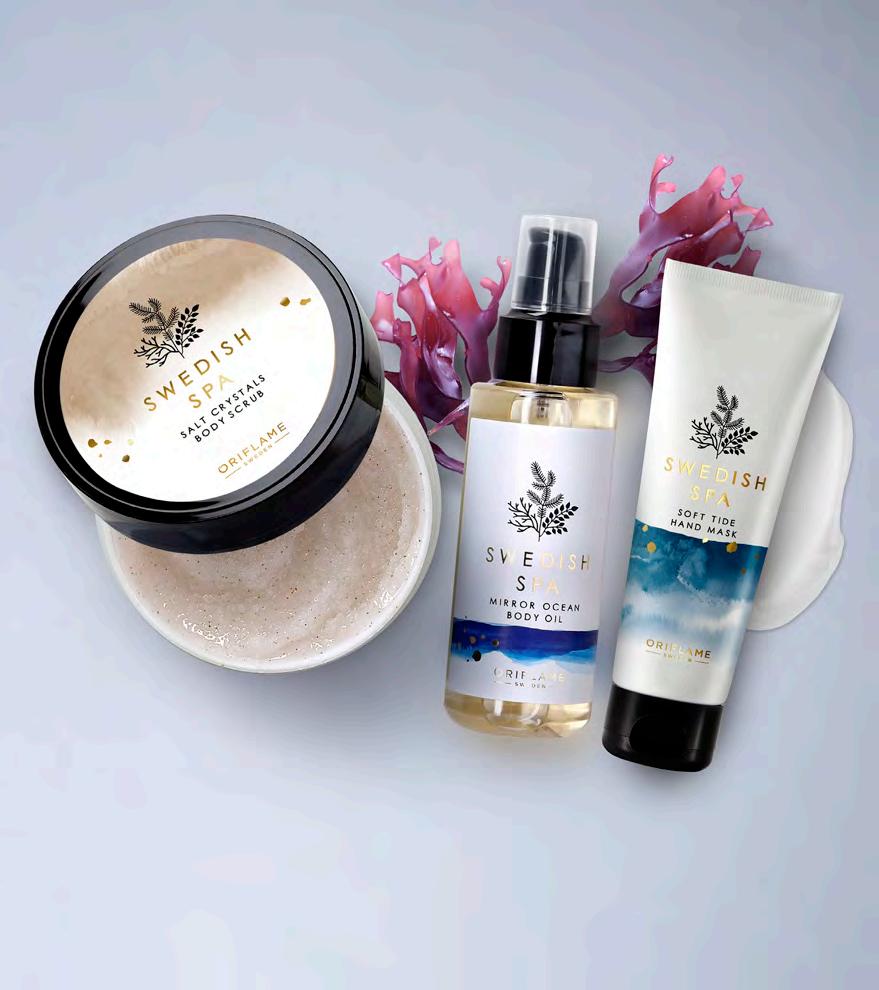 97 Омекотяваща маска за ръце Swedish Spa Soft Tide 75 мл 34730 10.00 лв. 5.49 лв. Ексфолиант за тяло Swedish Spa Salt Crystals 200 мл 34022 26.00 лв. 18.99 лв. Олио за тяло Swedish Spa Mirror Ocean 100 мл 34024 21.00 лв. 12.99 лв. За спокойствие отвътре и сияние отвън ЕКСФОЛИАНТЪТ ЗА ТЯЛО със солни кристали нежно ексфолиира и подхранва вашата кожа. ОЛИО ЗА ТЯЛО с лека текстура, подходящо за масажи и хидратация на тялото след баня. Луксозна, подхранваща МАСКА за копринено меки ръце