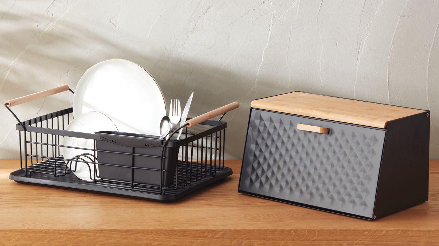 18лв. Комплект ножове в поставка, 4 бр. от неръждаема стомана, в поставка с дървен принт, комплектът включва: готварски нож, дължина 20 см, универсален нож, дължина 20 см, нож за хляб, дължина 19,5 см, нож за плодове и зеленчуци, дължина 9 см 6лв. Фруктиера метална, ø 23 см 18лв. Мелничка за пипер дървена, с керамичновисочина:острие,30см 20лв. Поставка за сушене на съдове метална, с дървени дръжки, размери: 46 х 26 х 18 см 40лв. Кутия за хляб метална, с бамбуков капак и предно отваряне, размери: 35,5 х 21,5 х 20 см 4лв. Поставкакухненсказахартия височина:метална,28,5см Всички продукти от брошурата са наши хит предложения. Търсете този символ, за да ги откриете в магазините ни.