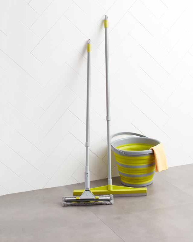 Reinigungszubehör teilweise aus Recycling-Kunststoff, verfügbare Varianten: Bodenwischer, Maße: 45 x 7,5 x 2 cm – 2,50 €, ohne Griff, Fensterwischer mit Teleskopgriff, Maße: 31 x 6 cm – 7 €