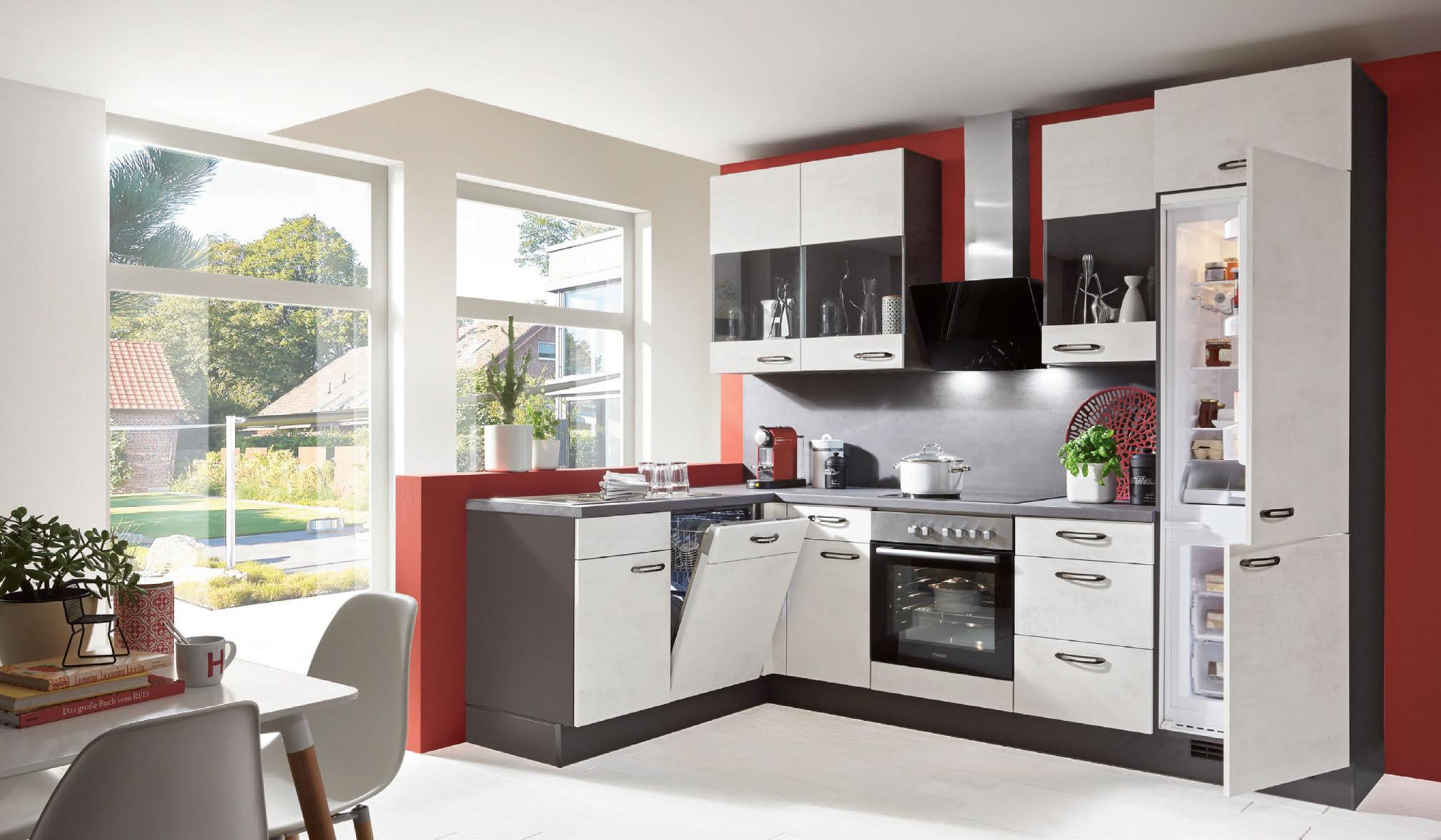 Riva ca. 175 x 275 cm, Front: Weißbeton Nachbildung, Korpus: Schiefergrau, Geräte-Abb. ähnlich, Geschirrspüler und Nischenrückwand