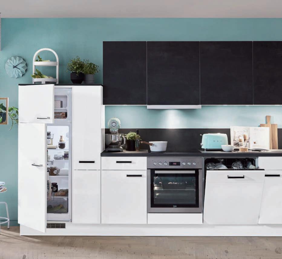 Flash ca. 320 cm breit, Front: Alpinweiß Hochglanz/Schwarzbeton, Korpus: Alpinweiß Glanz, Geräte-Abb. ähnlich, Geschirrspüler, Nischenrückwand und Beleuchtung gegen