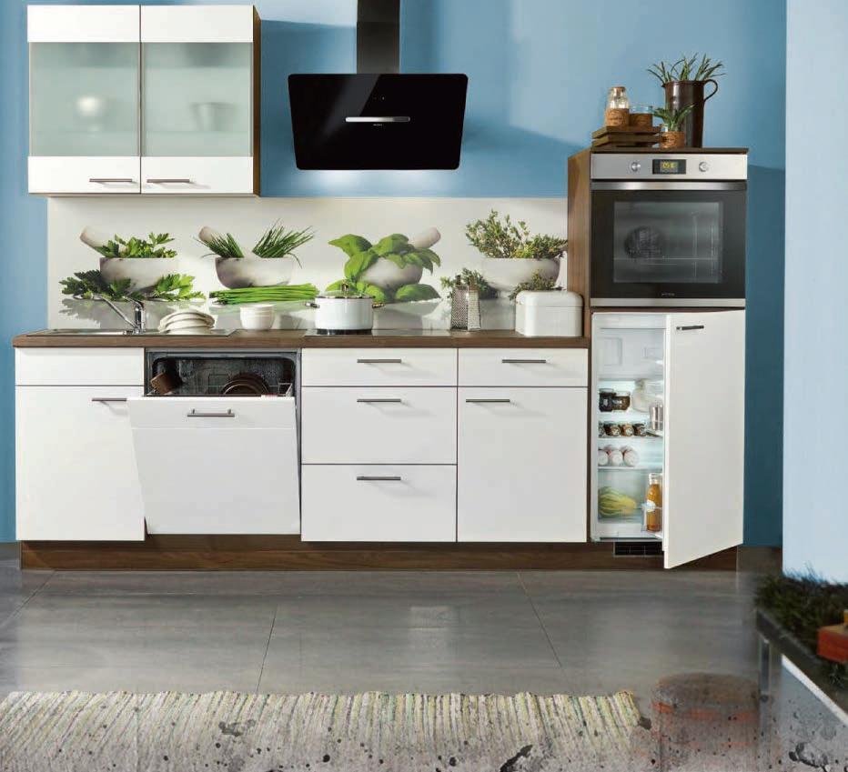 ca. 280 cm breit, Front: weiß Hochglanz, Korpus: Nussbaum Tabak Nachbildung, Geräte-Abb. ähnlich, Geschirrspüler, Nischenrückwand und Armatur gegen Mehrpreis 5385128/00