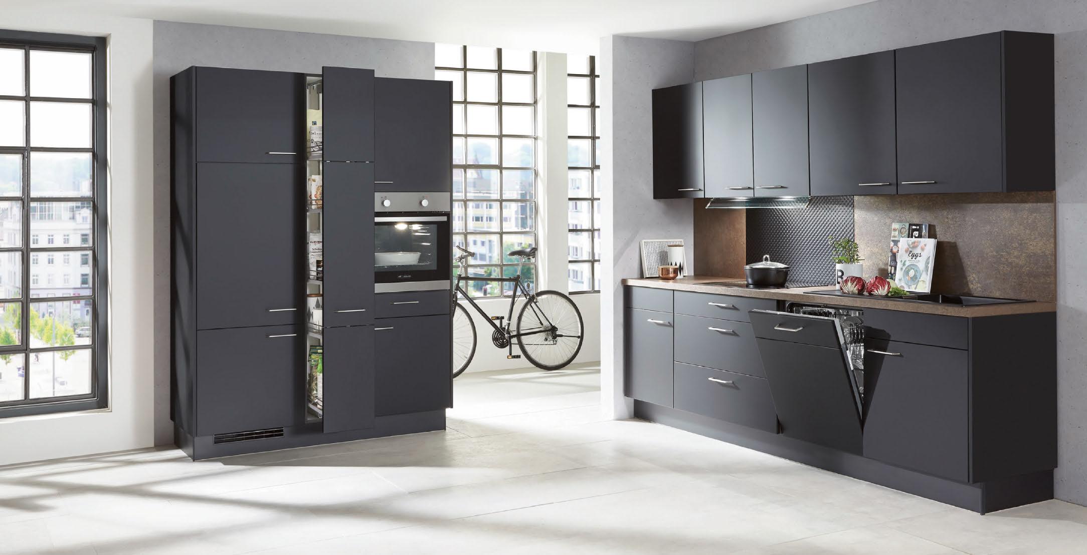 Touch ca. 154 und 264 cm, Front: Lacklaminat schwarz supermatt, Korpus: Schiefergrau, Absetzungen in Ferro Bronze Nachbildung, Geräte-Abb. ähnlich, Geschirrspüler und Nischenrückwand
