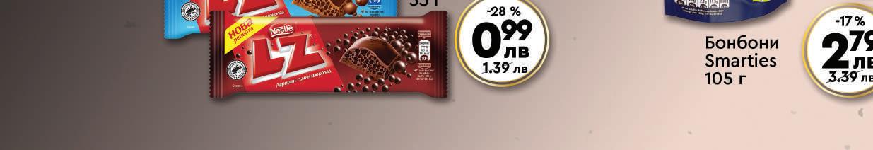 Каталог за период от 14 октомври до 20 октомври 2022 г. www.promarket.bg 199 лв 319 лв 369 лв 599 лв 089 лв 599 лв 749 лв 769 лв 189 лв Вафли Боровец 4 бр / 1 оп / 120 г Кафе Espresso Милано или Сицилия Tchibo 250 г Пурички Caprice класик Papadopoulos 400 г 2.69 лв -25% 4.19 лв -23% 4.69 лв -20% 9.29 лв -35% 1.19 лв -24% 9.99 лв -39% 9.65 лв -21% 9.49 лв -18% 2.59 лв -26% Сладолед разл. видове Carte D'or 900 мл Сладолед Aloma разл. видове Nestle 490 г / 1 оп Кафе Natural мляно Santos 200 г Бисквити Kings с шок. парченца разл. видове Allatini 180 г Бисквити Анелия разл. видове Pobeda 1 оп Шоколад Дарк разл. видове Roshen 85 г / 1 оп