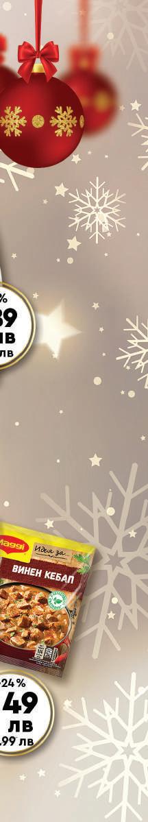 Посетете нашия сайт и бъдете първите, които научават за нашите най-нови промоции. www.promarket.bg “Промаркет” не носи отговорност при допуснати печатни грешки, смяна на визията на продуктите, както и при промяна на цените им. Цените важат само за продажби, в количества обичайни за домакинството. Цените са в лева, с включен ДДС. Промоциите са до изчерпване на количествата. Всички артикули се продават без декорация Снимките са примерни! Tел на потребителя: 02 / 973 38 28 Шоколад разл. видове Рошен 1 оп Десерт Twix 5 бр/оп 250 г Уиски Джони Уокър 399 лв 1749 лв 149 лв 2.49 лв -41% 1349 лв 18.99 лв -28% Кашкавал Краве мляко вакуум 1 кг КАТАЛОГ ЗА ПЕРИОД ОТ 16 ДЕКЕМВРИ ДО 22 ДЕКЕМВРИ 2022 г. САМО ЗА