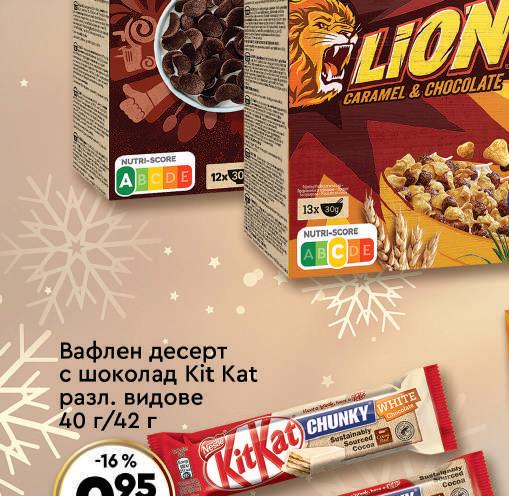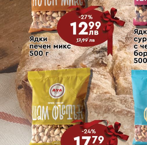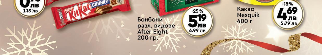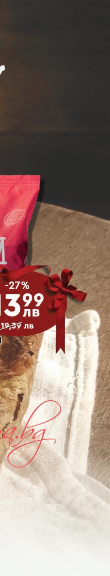 МАГАЗИНИ С ТОПЛА ТОЧКА: /РАБОТНО ВРЕМЕ: 7:30 - 22:00 ч./ • бул Сливница 172 - Площад Лъвов Мост (7:00-22:00) • бул. "Христо Ботев" № 131 (07:00 - 22:00 ч.) •4-2 ж к Полигона 42 жк Надежда 2, бул “Ломско шосе” № 68, до метростанция Надежда (07:00 - 22:00 ч.) бул. “Македония” № 24 ж к Младост 1, ул. “Димитър Доспевски” № 2 бул. “Ботевградско шосе” №46 ж к Младост 2, ул. “Проф Ал Теодоров Балан” № 5 • ул. “Георги С Раковски” № 60 • Нов обект: ж к Студентски град ул акад Жак Натан“ № 11 (7:00-24:00) Шоколад млечен с цели бадеми или с цели лешници ИОН 100 г 219 лв 2.99 лв -26% Шоколад разл. видове Ritter Sport 100 г Суха паста разл. видове Престиж 10 бр/кут/300 г 1.19 лв -16% 099 лв Десерт разл. видове Черноморец 80 г Суха паста с карамелен крем или фъстъчен крем Перун 60 г 229 лв 3.19 лв -27% 4.49 лв -32% 299 лв 0.89 лв -26% 065 лв Вафли обикновени с какао или с тахан ЗИВ Боряна 420 г 359 лв 4.79 лв -24%