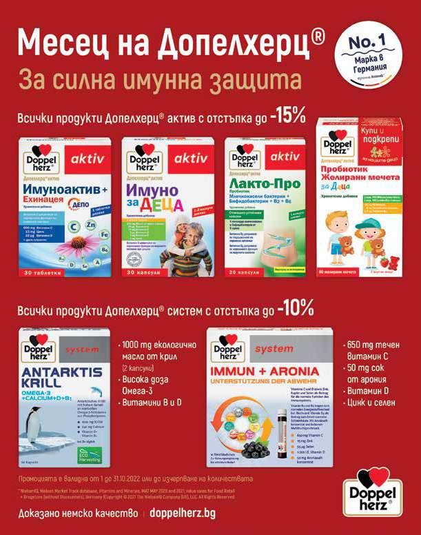 DEFENCE MY AGE Навършили сте 50 години? Погрижете се за кожата по най-добрия и възможен начин. Обновяващи концентрирани ампули за чувствителна и нетолерантна кожа Флакон с 60 еднодозови ампули 24 ml Обновяващ нощен крем За всеки тип кожа За зряла кожа С нежен аромат 50 ml Обновяващ серум за зоната около очите и устата за чувствителна и нетолерантна кожа За зряла кожа 15 ml Обновяващ дневен крем За всеки тип кожа За зряла кожа С нежен аромат 50 ml Интензивен обновяващ серум За всеки тип кожа За зряла кожа С нежен аромат 30 ml Hoвo начало на kpacomama Предложенията са валидни за периода 01-31.10.2022 г. или до изчерпване на количествата. Цените са с включен ДДС. Някои от продуктите не се предлагат във всички обекти. Възможни са разлики в цените в различните обекти. Възможни са разлики в цените и промоциите, обявени на сайта и тези в обектите. Във всички обекти и на remedium.bg се предлага богата гама от промо ционални продукти, които не са обявени в брошурата. Заповядайте и се възползвайте или ги разгледайте на сайта ни! Аптеки РЕМЕДИУМ си запазват правото да променят цените в посочения период. Аптеки РЕМЕДИУМ не носят отговорност при допуснати печатни грешки. Ваучер Награда Ваучер Подарък Всички аптеки приемат ваучери за подарък Flexi Pass и Подарък Pass, UP Томбоу, Идънред България. Можете да заплатите със следните карти: Бъдете социални 4956 6195 3687 4609 5460 6825 4956 6195 6399 7999