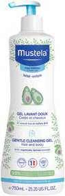 MUSTELA Нежен измиващ гел, 750 мл 93% натурални съставки. Цялостно почиства кожата и косата на новородените бебета и децата, като същевременно ги предпазва. Не дразни очите.