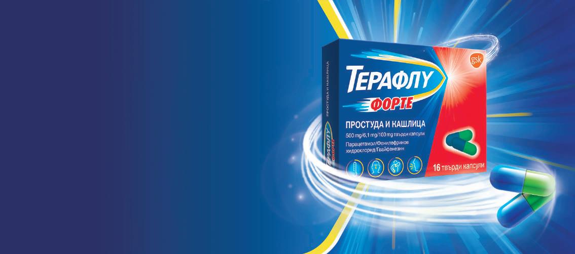 Терафлу Форте Простуда и Кашлица е лекарствен продукт без рецепта за възрастни и юноши над 16 години. Съдържа парацетамол, фенилефринов хидрохлорид и гвайфенезин. Използвайте Терафлу Форте Простуда и Кашлица САМО ако имате ВСИЧКИ изброени симптоми: болка и/или температура, запушен нос и продуктивна кашлица. Преди употреба прочетете листовката. А0293/09.12.2021 PM-BG-THRFL-21-00025 Търговски марки, притежавани или лицензирани от групата компании GSK. ©2021 Групата компании GSK или техен лицензодател.