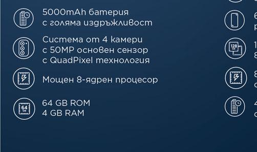 6999 39 119 6999 5499 1899 1799189991399 + зарядно за автомобил PD 36W + зарядно за автомобил CH21C 549 2079** True wireless слушалки HA-A3T True wireless слушалки CNS-TWS5 True wireless слушалки REDMI BUDS 4 • Компактен ергономичен дизайн • Вграден микрофон за разговори • Дo 7 часа време на възпроизвеждане с едно зареждане плюс до 7 часа от кутията за зареждане • Вграден микрофон за разговори • Сензорно управление • Дo 7.5 часа време на възпроизвеждане с едно зареждане плюс до 30 часа от кутията за зареждане • Вграден микрофон за разговори • Активно шумоподтискане • Дo 6 часа време на възпроизвеждане с едно зареждане плюс до 24 часа от кутията за зареждане • Магнитно захващане • Портативен и сгъваем • Режим Story • Управление с жестове • ActiveTrack 3.0 • Quick Roll • До 16ч. работа с едно зареждане • Товароносимост до 260g Жироскопична стойка SMOOTH Q2 Предпазно стъкло за MOTO G31/ G32/G62 Телефонът не е включен в комплекта Телефонът не е включен в комплекта M Т ф NokiaG21NokiaG60NokiaC21Nokia2660 ■ Екран: 6.5¨ (16.51 cm), 720x1600, IPS, 90 Hz ■ Памет: 128 GB (115 GB използваеми) ■ 4 GB RAM ■ Процесор Unisoc T606 ■ Тройна основна камера 50+2+2 MP ■ Предна камера 8 MP ■ Сензор за пръстов отпечатък ■ Батерия 5050 mAh ■ Екран: 6.58" (16.71 cm), 2408x1080, 120 Hz ■ Памет: 128 GB (114 GB използваеми) ■ 6 GB RAM ■ Процесор Qualcomm Snapdragon 695 с 5G връзка ■ Тройна основна камера 50+5+2 МР ■ Предна камера 8 MP ■ Батерия 4500 mAh ■ Екран: 6.5" (16.51 cm), 1600x720, IPS ■ Памет: 32 GB (25 GB използваеми) ■ 2 GB RAM ■ Процесор Unisoc SC9863A ■ Основна камера 8 MP ■ Предна камера 5 MP ■ Батерия 3000 mAh ■ Екран: 2.8" (7.11 cm), 240x320 ■ Камера 0.3 MP ■ Bluetooth, micro SD слот ■ Батерия: 1450 mAh ■ Удобна стойка за зареждане в комплекта 30999 59999 20999 14999 • Екран: 1.47 "(3.73 cm), AMOLED 194x368 • Крачкомер, Пулсомер • Измерване на кислород в кръвта • Измерване качеството на съня • Известия за обаждания и съобщения • Батерия 200 mAh • Екран: 1.09" (2.76 cm) • Крачкомер, Пулсомер • Известия за обаждания и съобщения • Измерване на кислород в кръвта • Измерване качеството на съня • Батерия 210 mAh Фитнес гривна REDMI BAND PRO Смарт часовник FIT 4910 Външна батерия Wireless 579131 • Капацитет на батерията 10000 mAh • Вход: USB-C 5 V/3 A • Изход: 2xUSB A 5 V/2,4 A • Изход: USB-C PD 5 V/3 A • Безжично зареждaне на съвместими устройства • USB-C кабел в комплекта • Индикатор за оставащ заряд • Размер на екрана 8.5" (21.6 cm) • Тънък и лек корпус, Бутон за изтриване • Писалка и батерия включени в комплекта. Таблет за рисуване SNAIL 8.5" NWT-1569 Прозрачен калъф SOFT за SAMSUNG A33 Закалено стъкло за SAMSUNG A33 НОВ МОДЕЛ • Екран: 6.4¨ (16.26 cm), 1080x2400, Super AMOLED, 90 Hz • Памет : 128 GB (101 GB използваеми) • 6 GB RAM • Процесор Samsung Exynos 1280 • Четворна основна камера 48+8+5+2 MP • Предна камера 13 MP • Батерия 5000 mAh • Екран: 6.70", DYNAMIC AMOLED 2X, 120 Hz • Двойна основна камера: 12+12 MP • Процесор: Qualcomm Snapdragon 8+ Gen 1 с 5G връзка • Размер на корпуса 44 mm • Екран: 1.36" (3.45 cm), AMOLED, 450x450 • Памет : 16 GB, 1.5 GB RAM • Анализ на телесния състав • Измерване качеството на съня • Измерване на кислород в кръвта • Операционна система: Wear OS • Батерия 410 mAh *Купи смартфон Samsung Galaxy Z Fold4, Z Flip4, S22 Ultra, S22+ или S22, в периода: 28.10 - 25.11.2022 г и вземи Galaxy Watch5 40mm или 44mm със 100 лв отстъпка Предложението е валидно в зависимост от търговските наличности при покупка в един покупен документ Посочената цена се отнася за Galaxy Watch5 44 mm, с включена отстъпка от 100 лв ** Посочената цена се отнася за Samsung Galaxy Z Flip4 128GB На цени от: • Екран: 10.5" (26.67 cm), 1920x1200 • Памет : 32 GB (19 GB използваеми) • 3 GB RAM • Процесор Unisoc Tiger T618 • Основна камера 8 MP • Предна камера 5 MP • Батерия 7040 mAh • LTE 429 499*/599 НОВ МОДЕЛ НОВ МОДЕЛ НОВ МОДЕЛ НОВ МОДЕЛ Н