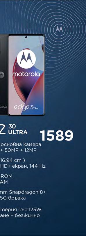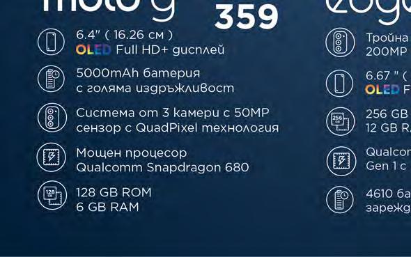 Процесор: A15 Bionic, Памет: 128 GB Екран: 6,1” Super Retina XDR OLED Двойна основна камера: 12+12 MP Екран: Always-On Retina display Процесор: Apple S8 Dual-Core Спортни режими, Sp02 949** на цени от 10x94,90 лв.* лихви такси ГПР 0% *Без лихва на 10 равни вноски. Първата вноска е платима на касата на Технополис при покупката. Останалите 9 вноски се финансират с кредит от ДСК Кредит, съгласно условията посочени в карето на ДСК Кредит, поместено на първа страница от настоящата брошура. **Цената от 949 лв. се отнася за Apple Watch S8, 41mm, GPS+Wi-Fi. Празниците продължават. Избери сега изгодно. 10x177,90 лв.* лихви такси ГПР 0% 1779 2349 Смартфон Xperia 1 IV • Екран: 6.5" (16.51 cm), 3840x1644, HDR OLED, 120 Hz • Памет: 256 GB, (231 GB използваеми), 12 GB RAM • Процесор Qualcomm Snapdragon 8 Gen 1 с 5G връзка • Тройна основна камера 12+12+12MP+3D ITOF 9499 Смартфон XR20 • Екран: 6.67 " (16.94 cm), 1080x2400 • Памет: 128 GB ( 111 GB използваеми), 6 GB RAM • Процесор Qualcomm Snapdragon 480 с 5G връзка • Двойна основна камера 48+13 MP с оптики ZEISS • Батерия: 4630 mAh • IP68 сертифициран - защита при потапяне в сладка вода до 1,5 метра за до 30 минути • 3 години гаранция *Пълните условия https://www.nokia.com/phones/bg_bg/ screen-replacement-promo-terms 42999 79999 109 799 Смартфон Cat® S42H+ Смартфон X80 LITE • Екран: 5.5 " (13.97 cm), 1440x720 • Памет: 32 GB (20 GB използваеми) • 3 GB RAM • Процесор Mediatek Helio A20 Quad-core • Oсновна камера 13 MP • Предна камера 5 MP • Батерия: 4200 mAh • Екран: 6.44" (16.36 cm), 2404x1080 • Памет: 256 GB (233 GB използваеми), 8 GB RAM • Процесор MediaTek Dimensity 900 с 5G връзка • Тройна основна камера 64+8+2 MP • Предна камера 50 MP • Сензор за пръстов отпечатък • Батерия 4500 mAh • Екран: 2.4" (6.1 cm), 240x320 • Камера 0.3 MP • Bluetooth, micro SD слот • SOS бутон • Батерия: 1400 mAh • Удобна стойка за зареждане в комплекта Мобилен телефон KX-TU155EX • Екран: 1.28" (3.25 cm), 240x240 • Крачкомер, Пулсомер • Измерване на кислород в кръвта • Измерване качеството на съня • Известия за обаждания и съобщения • Батерия 250 mAh Смарт часовник LF28 PRO ■ Екран: 6.53" (16.59 cm), 720x1600 ■ Памет: 32 GB (20 GB използваеми) ■ 2 GB RAM ■ Процесор MediaTek Helio G25 ■ Основна камера 13 MP ■ Предна камера 5 MP ■ Батерия: 5000 mAh 18999 8950 439 Redmi 9A ■ Екран: 6.71¨ (17.04 cm), 1650x720, IPS ■ Памет: 64 GB (38 GB използваеми) ■ 4 GB RAM ■ Процесор Qualcomm Snapdragon 680 ■ Двойна основна камера 50+2 MP ■ Предна камера 5 MP ■ Сензор за пръстов отпечатък ■ Батерия 5000 mAh 315 ■ Екран: 6.43¨ (16.33 cm), 2400x1080, AMOLED, 90 Hz ■ Памет: 64 GB (43 GB използваеми), 6 GB RAM ■ Процесор MediaTek Helio G96 ■ Четворна основна камера 108+8+2+2 MP ■ Предна камера 16 MP ■ Батерия 5000 mAh ■ Силиконов калъф в комплекта Смарт часовник GT 3 PRO Elegant • Eкран: 1.32" (3.35 cm), сапфирен кристал, AMOLED 466x466 • Mикрофон, високоговорител • Известия за обаждания и съобщения • Измерване на кислород в кръвта • Измерване качеството на съня • Батерия: до 1 седмица издръжливост в зависимост от интензитета на използване ■ Екран: 1.62" (4.12 cm), AMOLED 192x490 ■ Крачкомер Пулсомер ■ Измерване на кислород в кръвта ■ Измерване качеството на съня ■ Известия за обаждания и съобщения ■ Батерия 180 mAh + ДОПЪЛНИТЕЛНА КАИШКА HUAWEI WATCH GT 20 MM + ЗАРЯДНО ЗА АВТОМОБИЛ CAT M8J6 + Силиконов калъф в комплекта 10 x 79.90 лв 78999 10 x 78.99 лв 6 x 71.66 лв 20 x 117.45 лв 10 x 79.99 лв 10 x 158.90 лв 6 x 73.16 лв + външна батерия 5 000 mAh PB-50 + В комплект със слушалки Sony WF1000XM4 + зарядно за автомобил 3.1А www.technopolis.bg 6 Цените са в лева с ДДС Ако не е посочено друго, търговската гаранция на стоките е със срок 2 години Всички стоки са със законова гаранция съгласно Закона за защита на потребителите