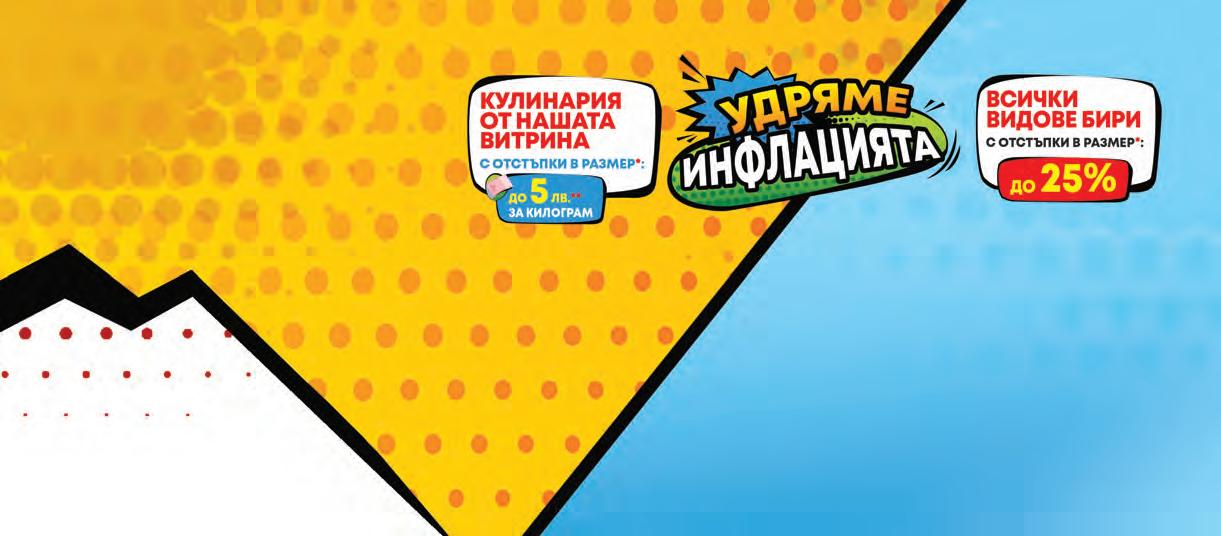 7 Свински печени уши кг -25% 26,99 1999 Пържено кюфте „ПРЕМИУМ” бр. -38% 1,29 079 ОТ НАШАТА ВИТРИНА С ОБСЛУЖВАНЕ Маслини черни Турски Услу 301 - 360**, кг -31% 7,99 549 Салата Витамина кг САМО 799 Баничка -47% 1,69 0 *Номерацията показва брой маслини в 1 кг КУЛИНАРИЯ И ОЩЕ от вторник 09.05. до 15.05.2023 ОТ НАШИЯ ХЛЕБЕН БАР Хляб многозърнест, ОТ НАШИЯ ХЛЕБЕН БАР -20% 2,49 199 -30% 4,99 349 Баклава „АМБЕЛИНО” 450 г Пържен хек кг САМО 19,99 1799 Маслини BLOND 180 - 230* , кг ОТ НАШАТА ВИТРИНА С ОБСЛУЖВАНЕ -22% 8,99 699 Салата Баварска кг САМО 899 Ориз със спанак кг -20% 9,99 799 Задушени картофи на шайби с копър кг -23% 8,99 689 Пиле фрикасе кг -27% 17,99 1299