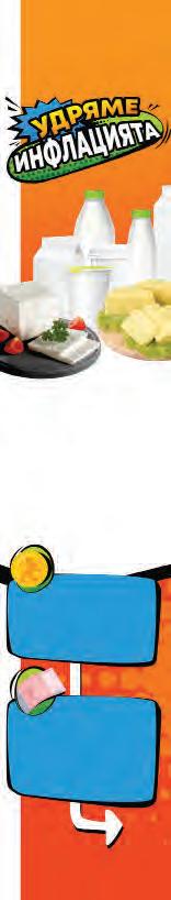 7 от вторник 08.11. до 14.11.2022 Йогурт „MLEKOVITA” различни видове, 350 г -20% 2,49 199 -20% -23% 3,89 299 Топено сирене „ЖОСИ” 200 г -27% 5,49 399 Гауда, Моцарела или Хаварти „ARLA” слайс, 150 г -27% 3,99 289 Топено сирене „LA VACHE QUI RIT ” различни видове, 120 г Млечна напитка „DANONINO” ягода, банан, 4 х 100 г САМО 3,55 309 -27% 6,69 485 Напитка „ВЕРЕЯ” без захар, различни видове, 1 л Кисело мляко „БОЖЕНЦИ” 4%, 400 г -21% 1,89 149 -21% 1,65 129 Айрян „БАЛКАН” 500 мл Продукт за мазане „TOMMI” с масло, 500 г -23% 2,99 229