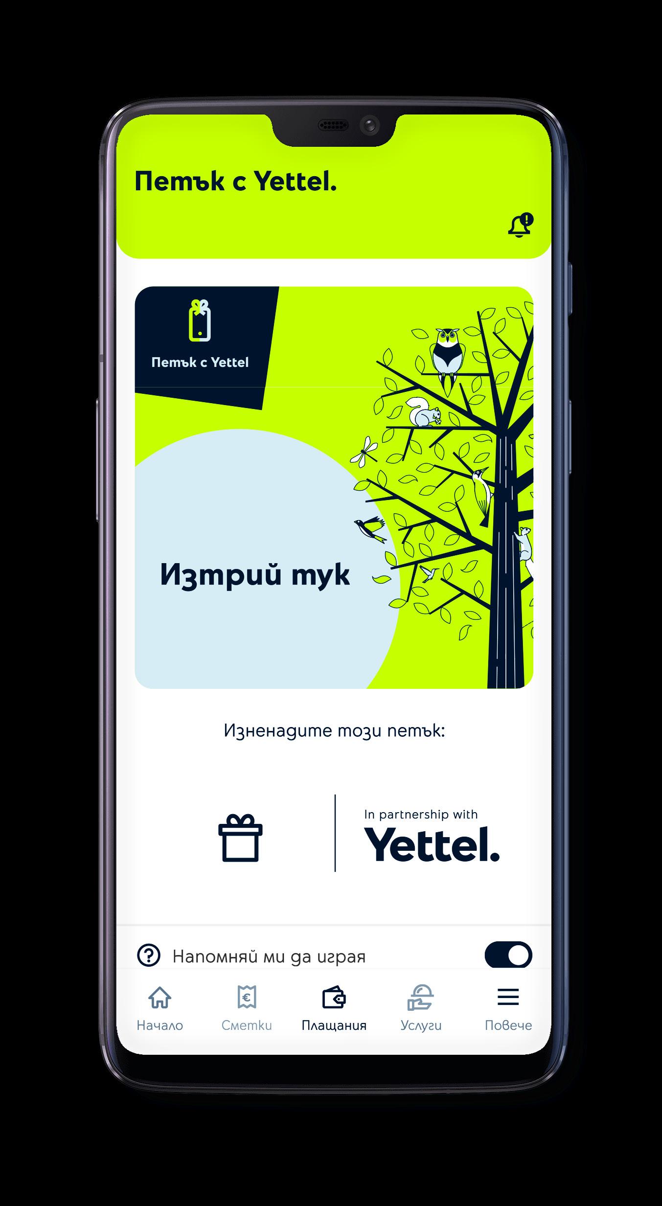 6 Някои функционалности на мобилното приложение могат да зависят и да се различават, в зависимост от използваните от потребителя услуги. Пълна информация на Yettel.bg Играй за изненади Играй тук In partnership with Петък с Yettel само в мобилното ни приложение