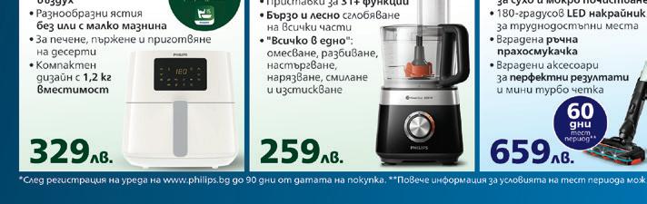 Хлебопекарна Тefal 20 автоматични програми за различни видове хляб, кекс, сладко и кисело мляко 3 настройки на грамажа 3 нива на изпичане Отложен старт до 15 часа 219 лв. 6999 лв. 56 лв. 99 лв. 109 лв. 299 лв. лв. 65 лв. 189 лв. Уред за готвене с горещ въздух Tefal Ultra fry EY111B • Технология Hot Air за вкусни и хрупкави ястия с малко или без мазнина • 8 автоматични програми • 4,2 л вместимост – до 4 порции • Регулируем термостат до 200 °С • Съд с незалепващо покритие Блендер Tefal BlendForce 2 BL4208 • Smart Lock система за пасиране без усилие • 2 скорости + функция Pulse • Кана с 1.25 л полезна вместимост • 4 остриета за перфектно пасиране • Възможност за миене в съдомиялна • Функция за трошене на лед • 600 W мощност Парогенератор Tefal Express Essential SV6116 Унищожава до 99.9% от микробите 5.3 bar налягане на парата Ударна пара до 270 г/мин Антиваровиков колектор Автоматично изключване 2200 W мощност Ютия Tefal Express Steam FV2839 • Керамична плоча с незалепващо покритие • Ударна пара до 185 г/ мин • Антиваровикова и антикапкова система • 2400 W мощност Съдове за готвене Tefal So Chef на специална цена • Устойчиво незалепващо покритие за готвене всеки ден • Съвместимост с всякакви котлони, включително с индукция • Индукционна технология THERMO-FUSION™ • Индикатор за готовност на готвене THERMO-SIGNAL™ G2670572 Електрическа кана Tefal Element KO2001 • Безкабелна употреба с 360° ротационна основа • Подвижен антиваровиков филтър • Индикатор за нивото на водата • Автоматично изключване • 1.7 л вместимост • 2400 W мощност Хлебопекарна Тefal 20 автоматични програми за различни видове хляб, кекс, сладко и кисело мляко • 3 настройки на грамажа • 3 нива на изпичане • Капацитет: 1 кг • Отложен старт до 15 часа • Аксесоари Фритюрник Tefal • Вместимост: до 600 г • Система „Хладни стени” • Лесна употреба • Компактен дизайн • 800 W мощност • 5 скорости + функция Turbo • Бъркалки от неръждаема стомана за леки смеси и тесто • Мерителна купа • Удобен захват на дръжката • 500 W мощност So Chef Парогенератор Tefal Express Essential SV6116 Унищожава до 99.9% от микробите • 5.3 bar налягане на парата • Ударна пара до 270 г/мин • Антиваровиков колектор • Автоматично изключване • 2200 W мощност *Промоцията е валидна за следните модели парогенератори Tefal: GV9x, GV8x, GV7x, GV6x, GV5x, GV4x и SVx, закупени в периода 01.02.2022 г. - 31.01.2023 г. 60-дневният тест период влиза в сила от датата на закупуване на уреда. Уредът трябва да бъде върнат в оригинална опаковка с покупен документ в магазина, от който е закупен. Повече информация на tefal.bg ТЕСТ П ЕРИОД ТСЕТ П ДОИРЕ 60 дни* 5 x 59,80 лв. 3499 FTB-15P Тостер • Мощност: 700 W • Таймер • Повторно нагряване • Размразяване • Широк отвор • Tавичка за трохи Грил преса • Мощност: 2000W • Терморегулатор на двете плочи • Керамично покритие на плочите • Отваряне на 180° • Съд за събиране на мазнина 6999 13999 FEM-1695 Red Кафемашина • Мощност: 1100W • Крема диск • Подгряване на чашите • Налягане: 15 bar • Контейнер за вода: 1,2 л • Парна дюза за капучино • Цвят: Червен Хлебопекарна • Мощност: 800W • Капацитет: 1125 гр • 12 дигитални програми • LED дисплей • С две бъркалки за месене • Две отделения за приготвяне на хляб 13999 19999 Уред за здравословно готвене • Мощност: 2000W • Вместимост: 11 л • Таймер • Защита противпрегряване • Дигитален панел за управление • Барбекю шиш • Шиш за пиле 14999 Пречиствател за вода и въздух Озонатор • Произвеждан озон: 500mg/h • Функция Йонизиране на въздуха • Мощност: 18W • Газов поток: 3-3.6L/min FHB-959 BX Пасатор • Мощност: 600W • 2-