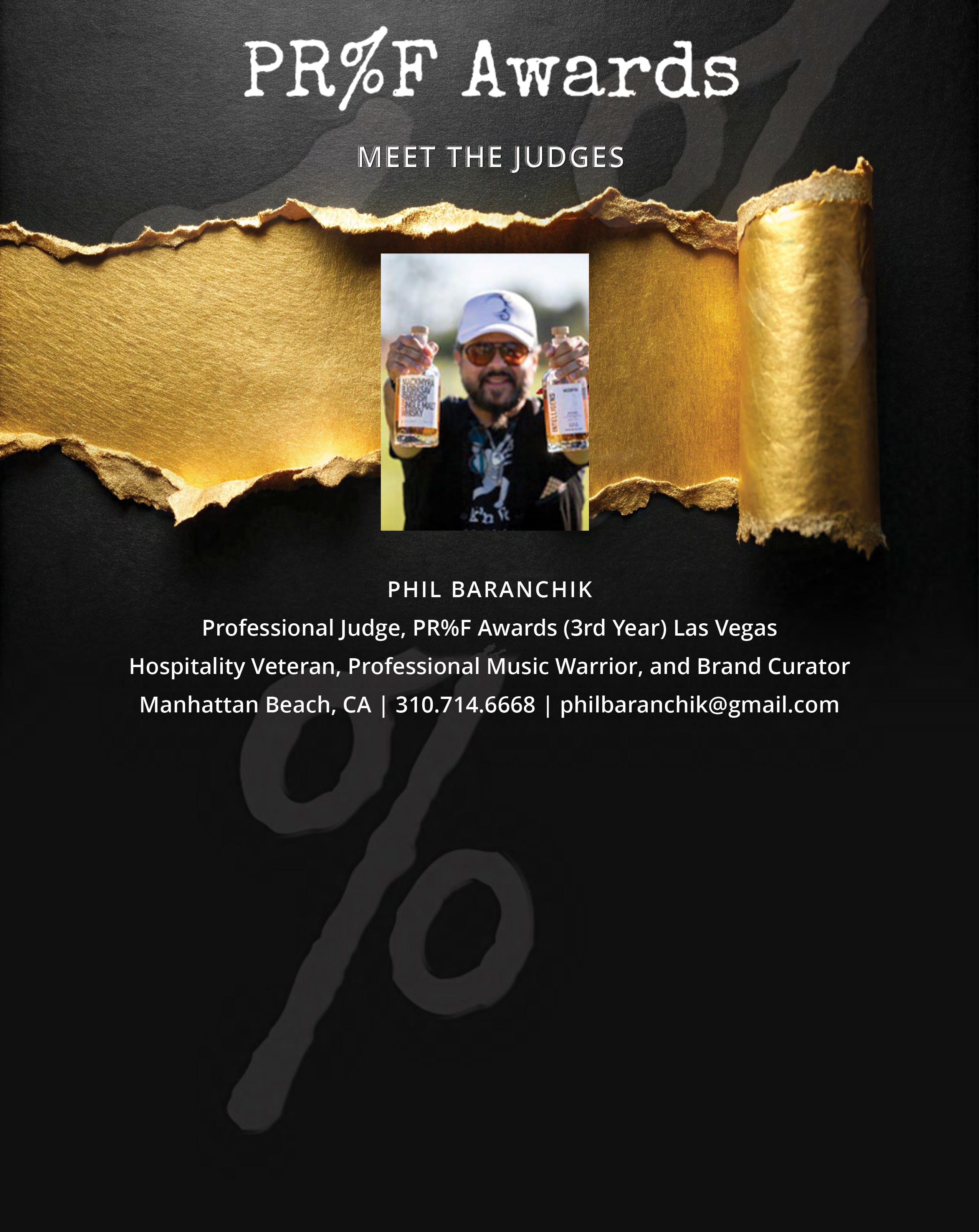 As PR%F enters its 7th year, powered by Food & Beverage Magazine, judged exclusively by buyers with real purchasing muscle, and split between Masked/Taste (double-blind purity) and Unmasked/Design (total package marketability), Phil’s third-year seat is no accident. Grandson of a World War II Battle of the Bulge hero, Gen-X hustler who started with paper routes and drywall dust, Phil judges with the soul of a survivor and the swagger of a Frontman. For Phil, judging PR%F isn’t a gig, it’s a calling. Where every medal awarded echoes the thrill of a sold out show, or a perfectly timed pour. In the end, it’s about investing in experience, as Phil says: “Life is who you know…and the Respect you earn.” With his insider’s eye, Phil helps brands not just win awards, but conquer shelves, stages, and souls.