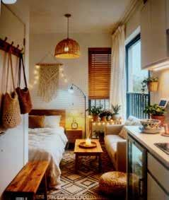 Hang curtains as high as possible to create the illusion of greater height. If you plan to keep only the essentials — such as a sofa, coffee table, or dining set —choose pieces with character. Second-hand markets can offer remarkable furniture finds. Use your creativity. Lighting is also key to enhancing the sense of space. Floor lamps with warm light can help. Create a cozy atmosphere.