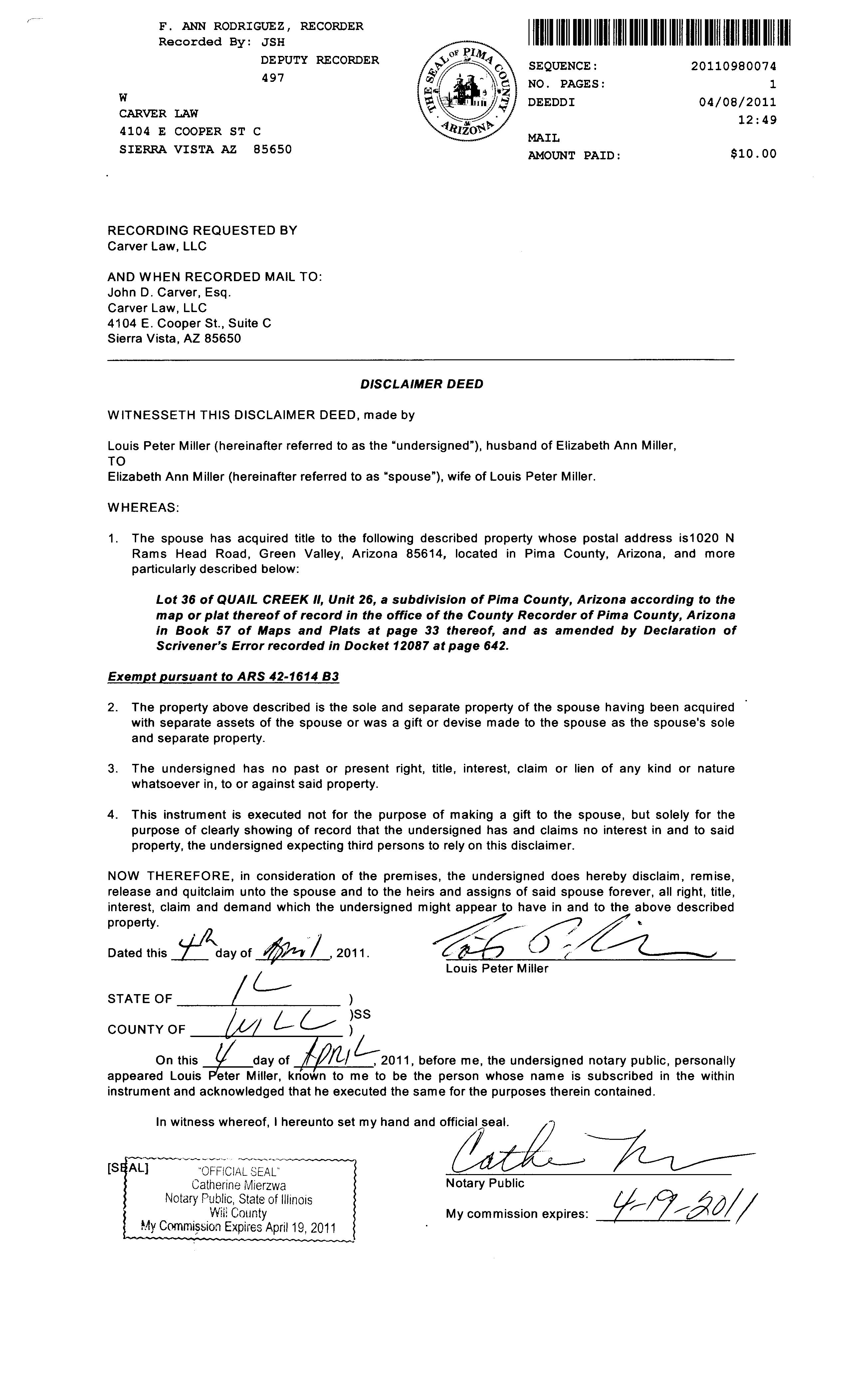 OWNER: MILLER ELIZABETH A / AFFIDAVIT 2011 980073 04/08/2011