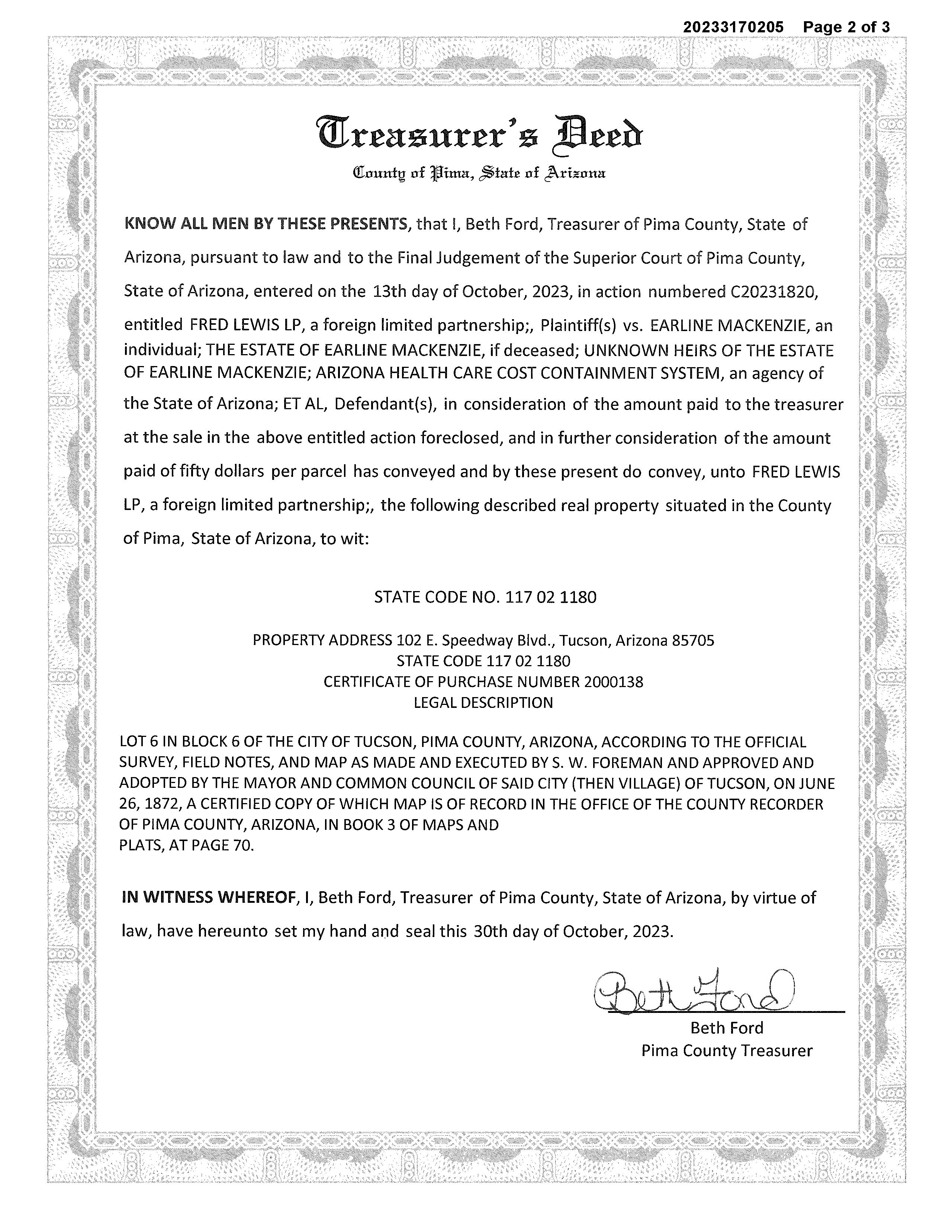 OWNER: FRED LEWIS LP     2023 3170205 11/13/2023