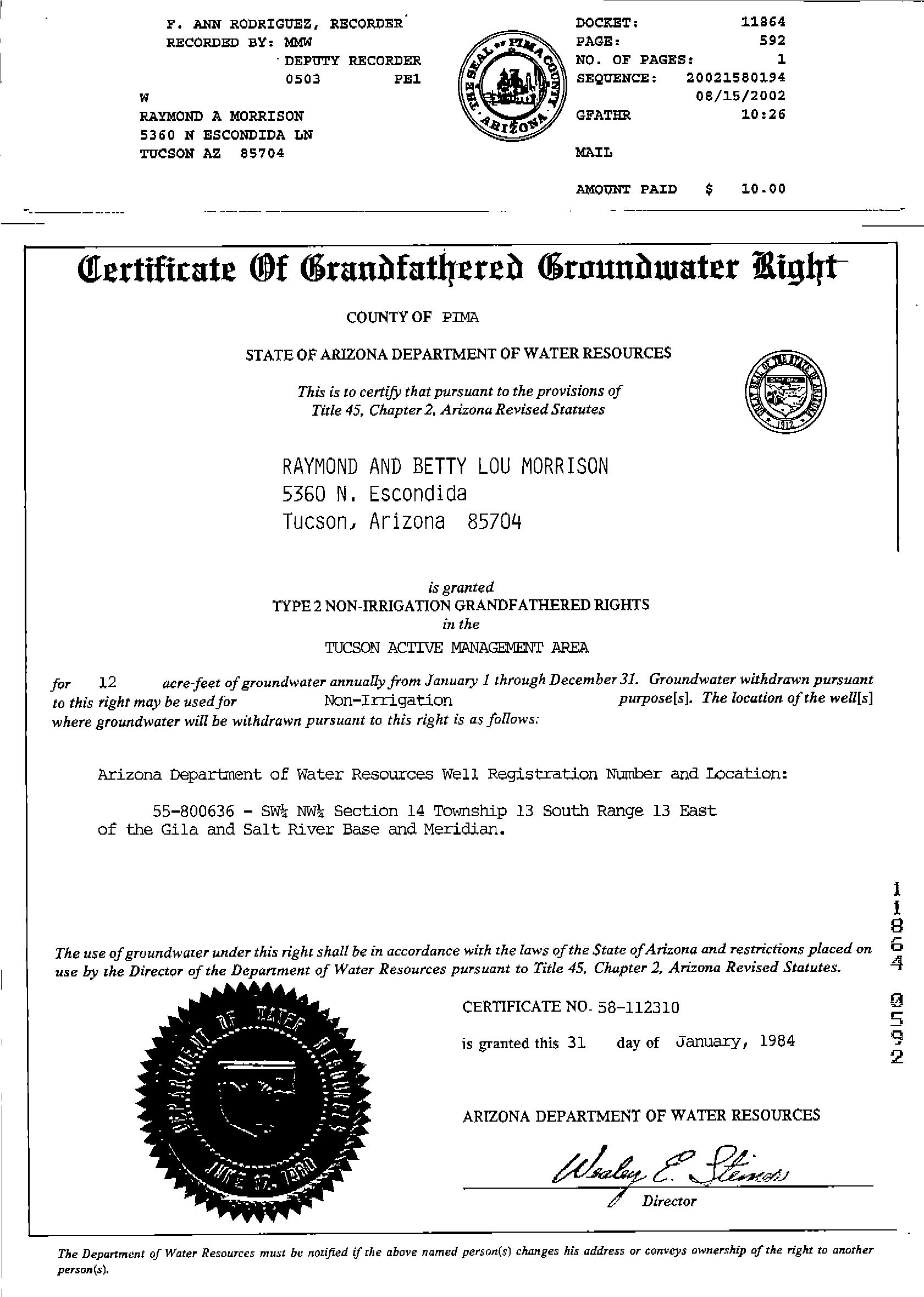 OWNER: MORRISON RAYMOND A & BETTY LOU CP/RS 12637 875 09/13/2005 MAIL: 5360 N ESCONDIDO LN