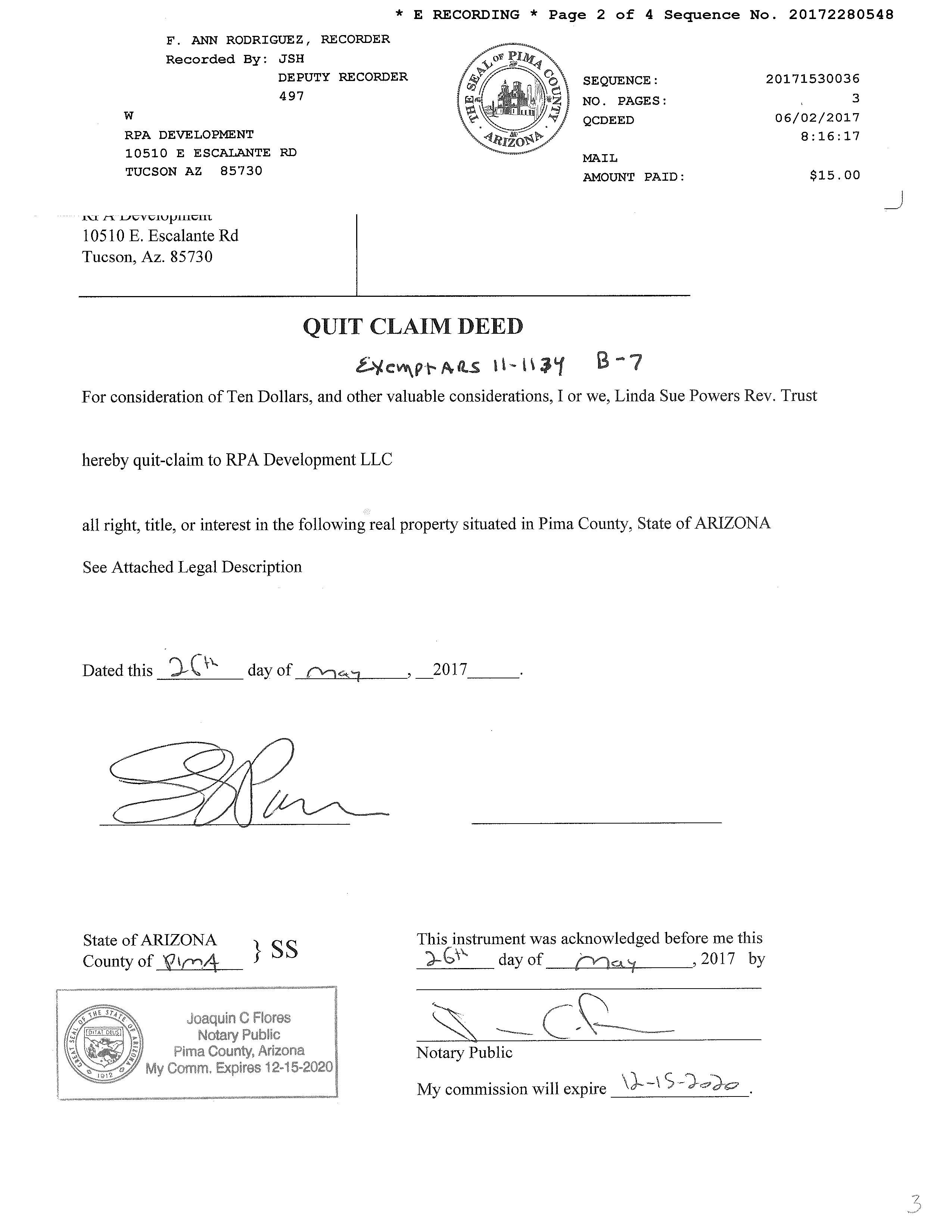 Mailing Address : 10530 E Escalante Rd, Tucson AZ 85730-5537 C067