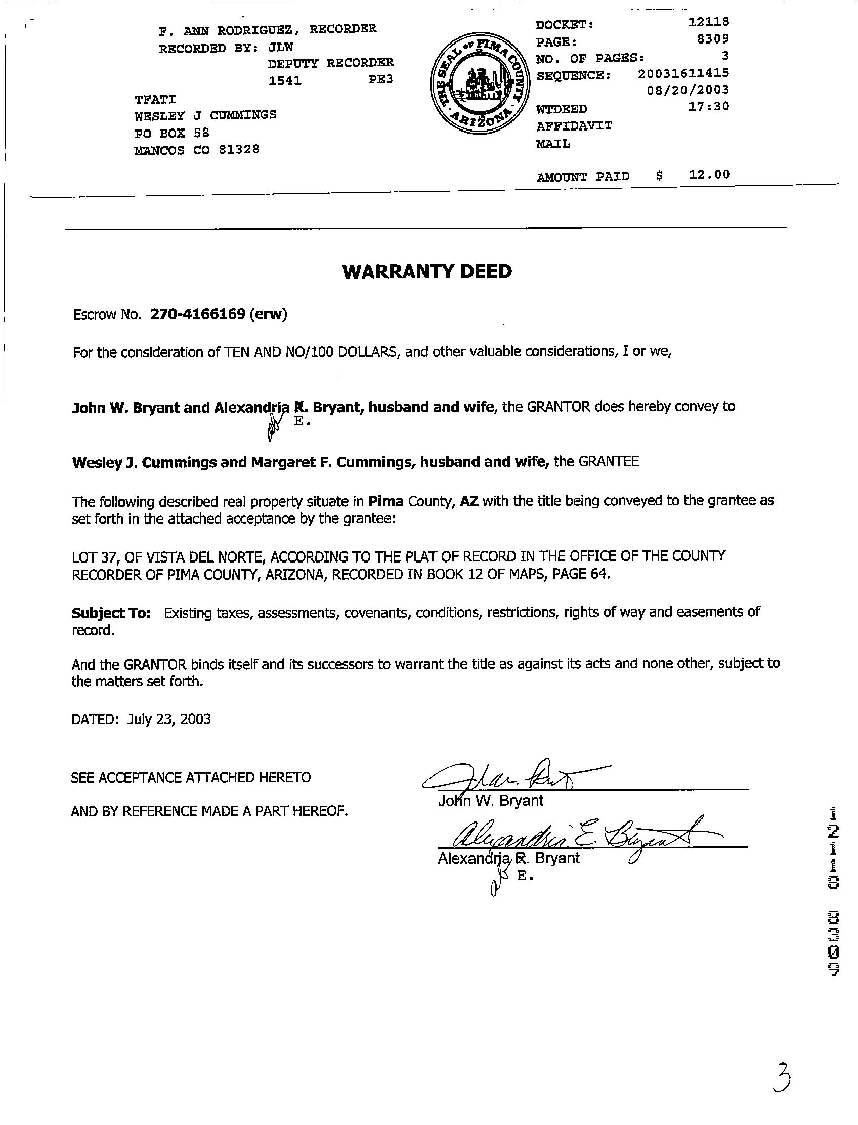 Seller Name : Bryant John W & Alexandria
