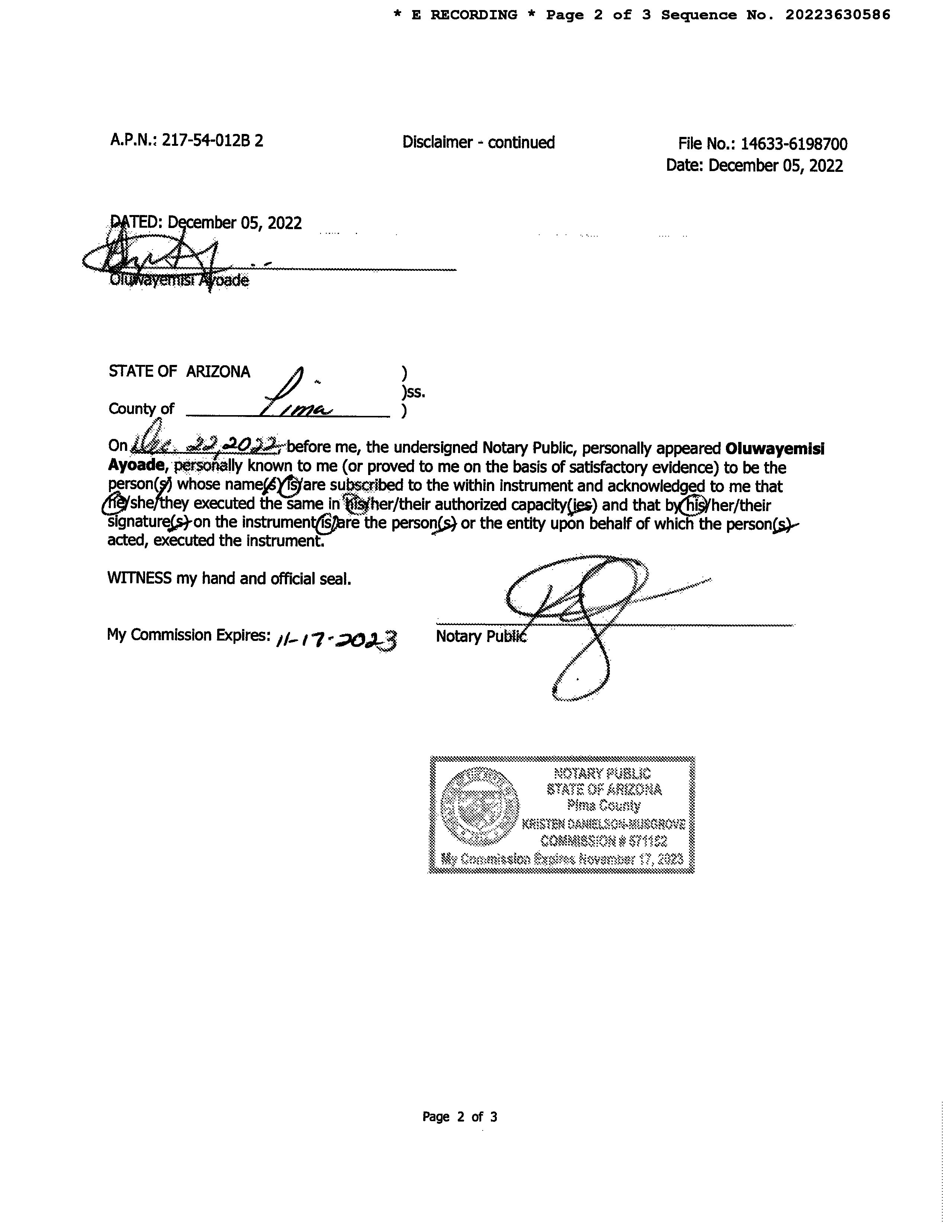 This information is furnished without fee and without benefit of a complete title search. No liability is assumed by First American Title. If it is desired that liability be assumed, you may apply for a policy of title insurance with First American Title Insurance Company.