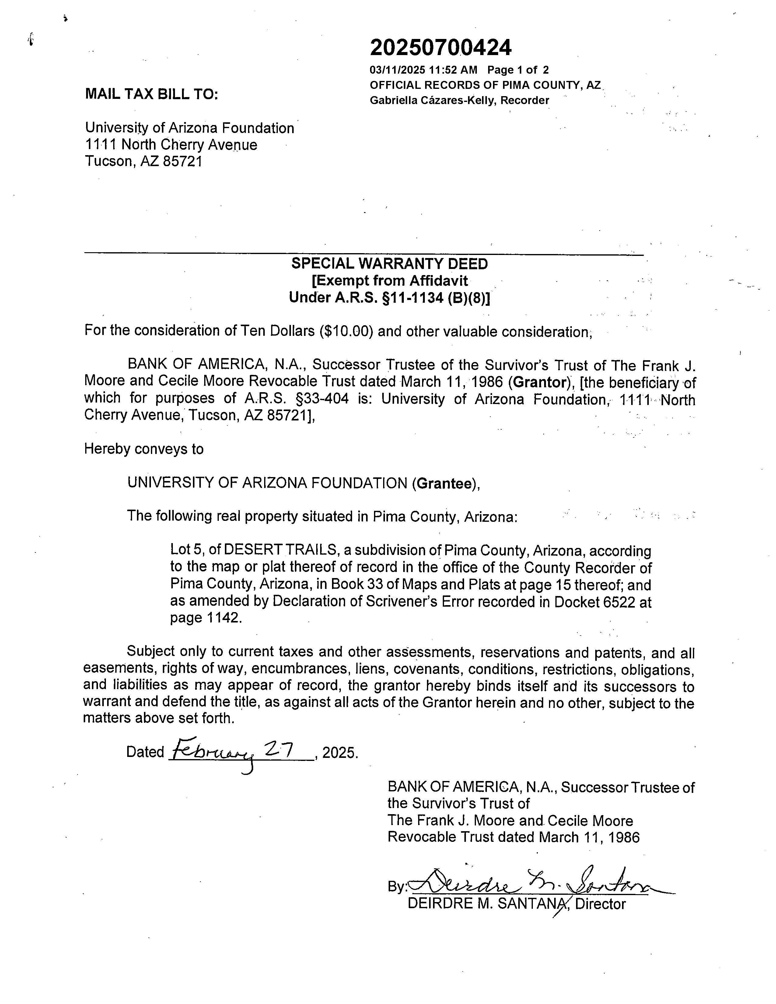 OWNER: UNIVERSITY OF ARIZONA FOUND AFFIDAVIT 2025 700424 03/11/2025
