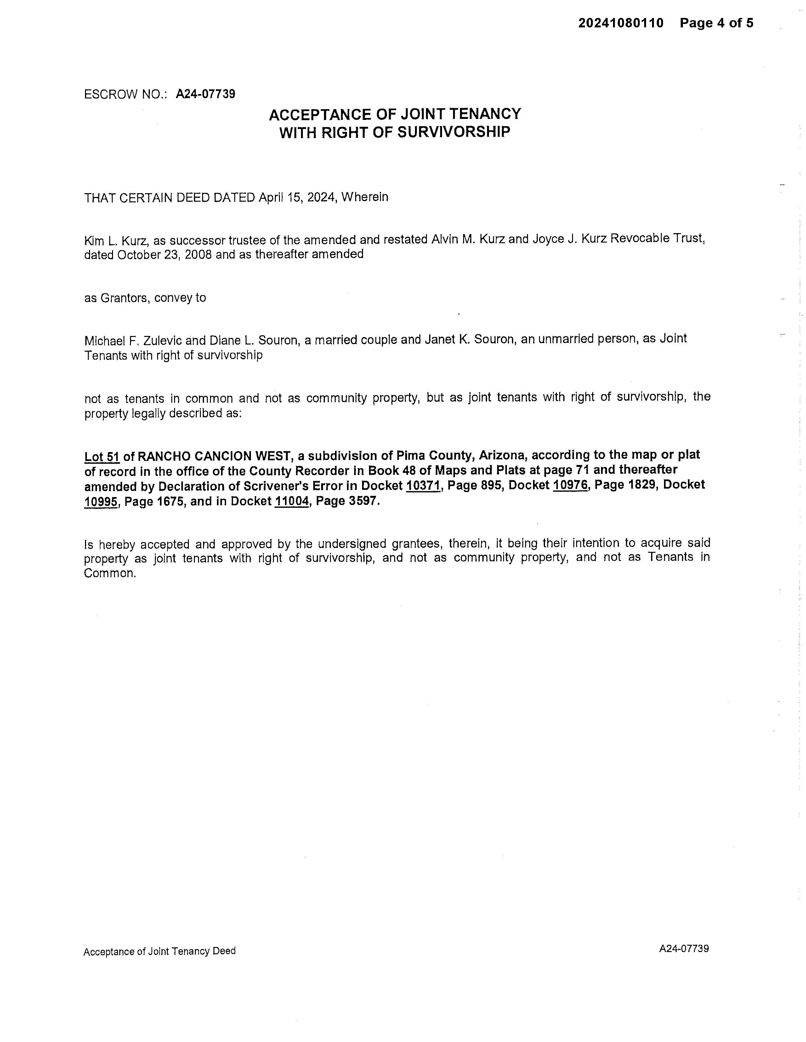 PrimaryOwnerName(s) ZULEVICMICHAELF&SOURONDIANEL&SOURONJANETK(ALLJT/RS) Vesting JointTenantswithRightofSurvivorship