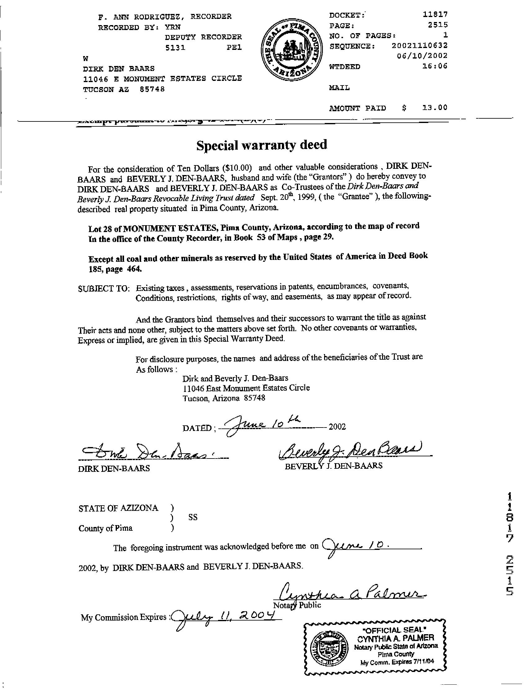 Prior Rec/Sale Date : 07/27/2001 / 07/20/2001