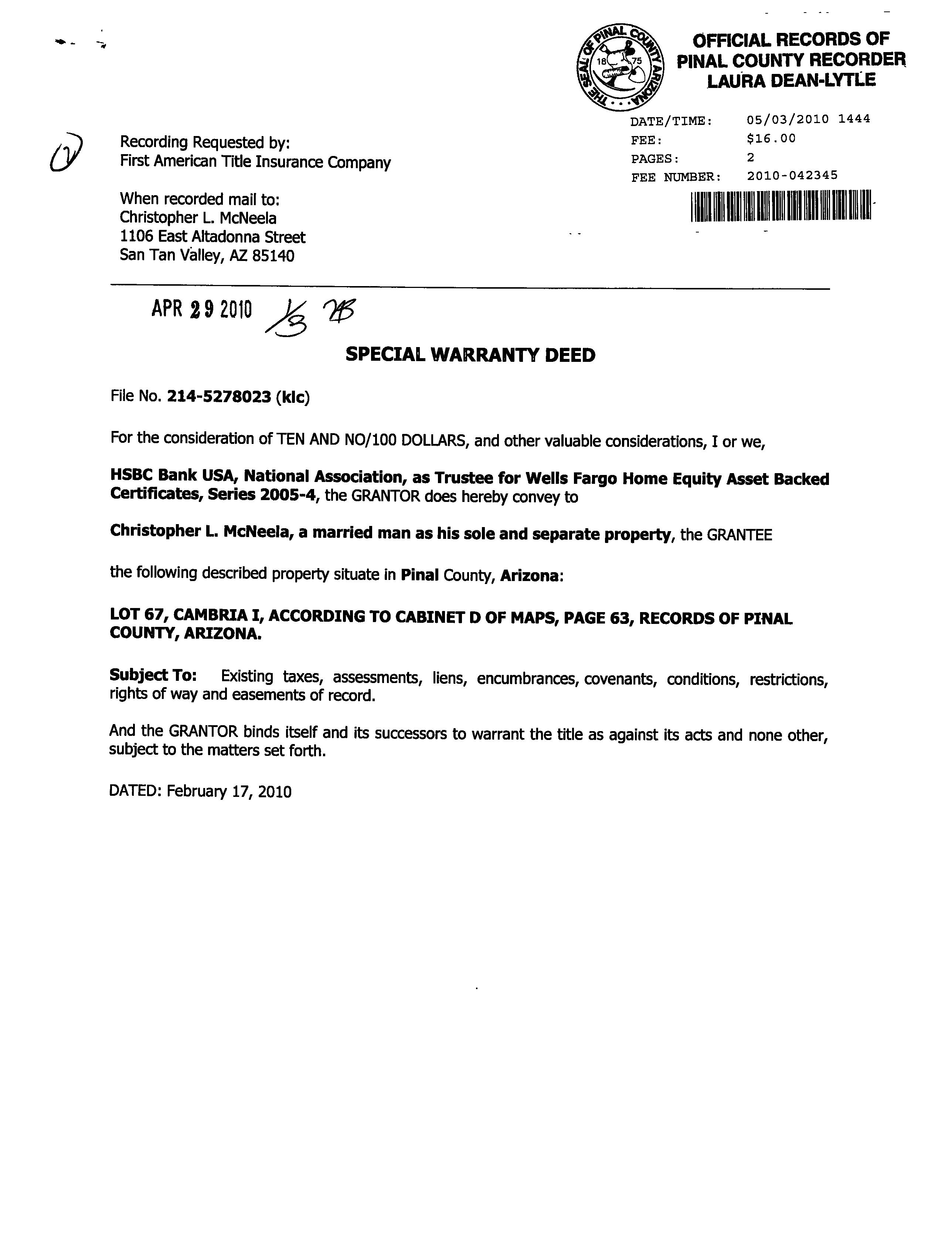 Owner Name: Mcneela Christopher L / APN / Alternate APN: 109-51-067 / Deed Type: Special Warranty Deed