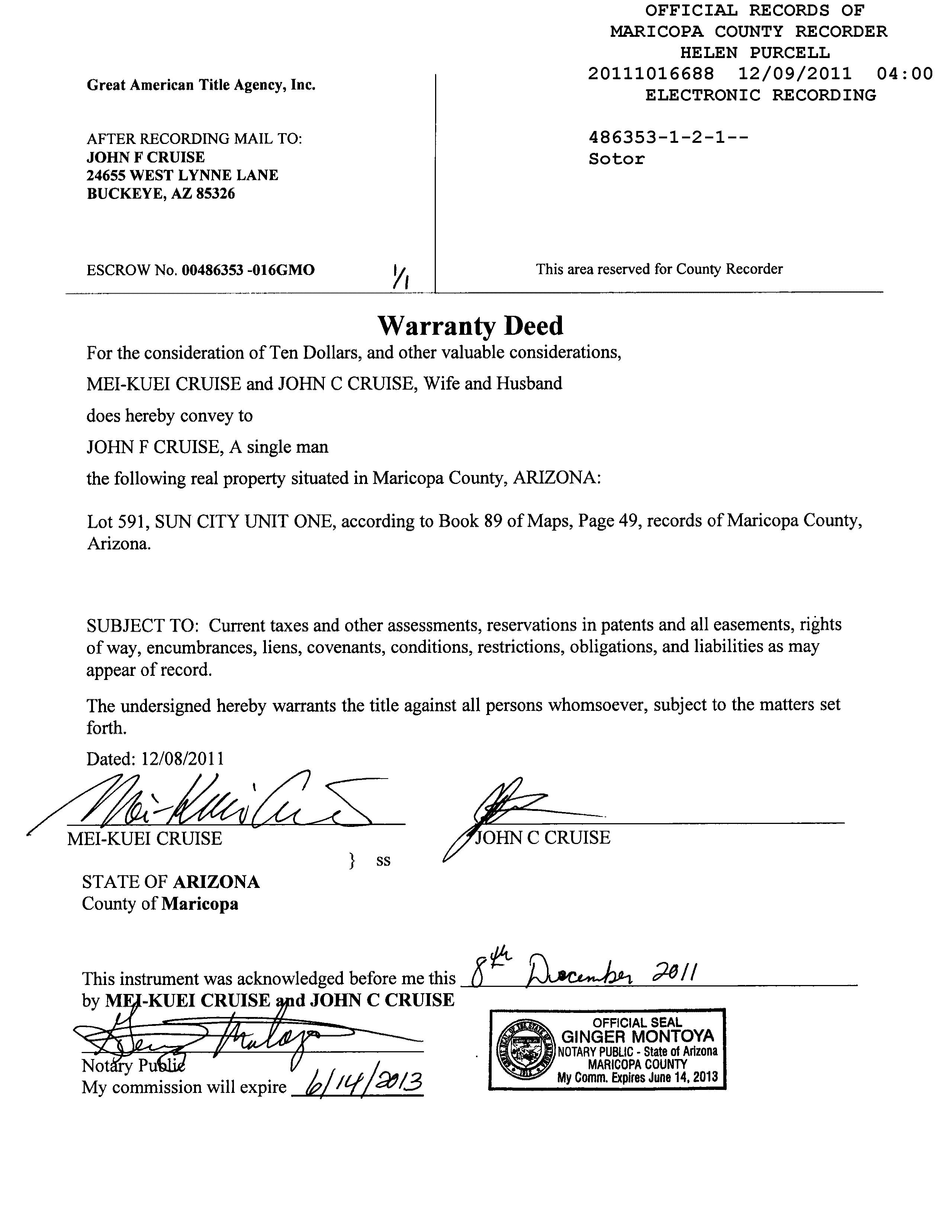 OWNER: CRUISE JOHN F 2011 1016688 12/09/2011