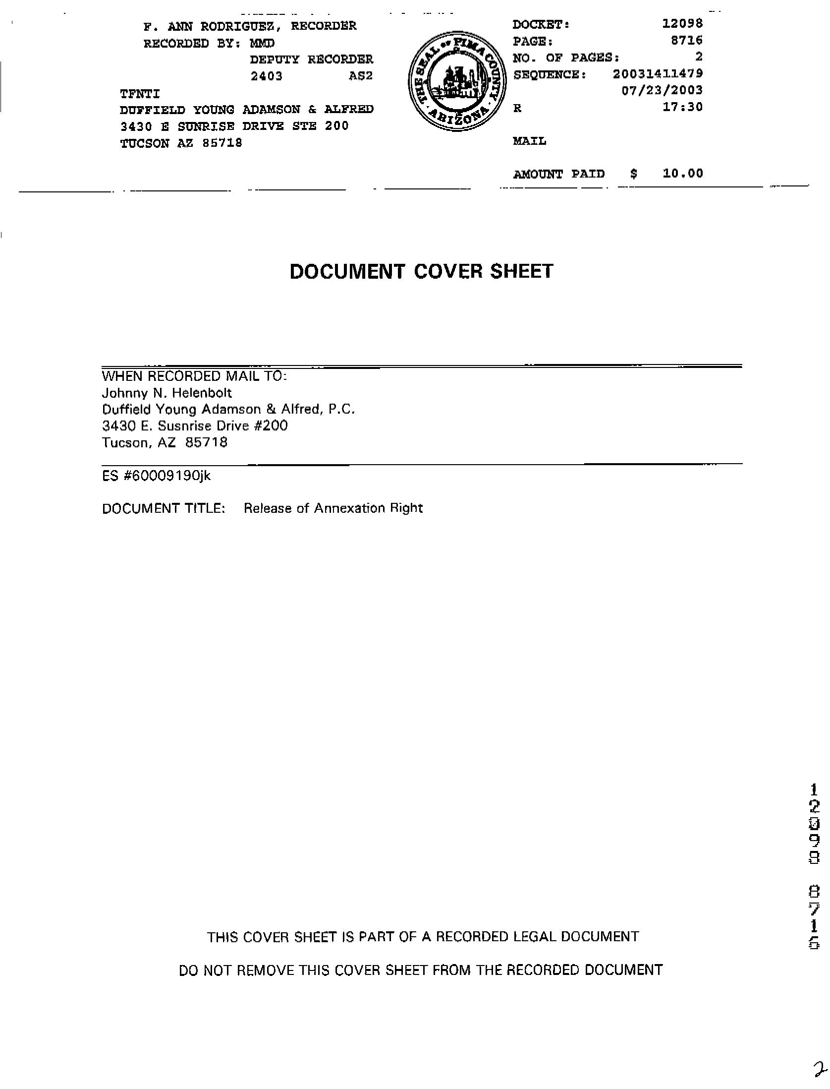 #7 307 E Calle Trona Green Valley Az 85614 Owner Name: Austin Sheila K /Austin Deborah