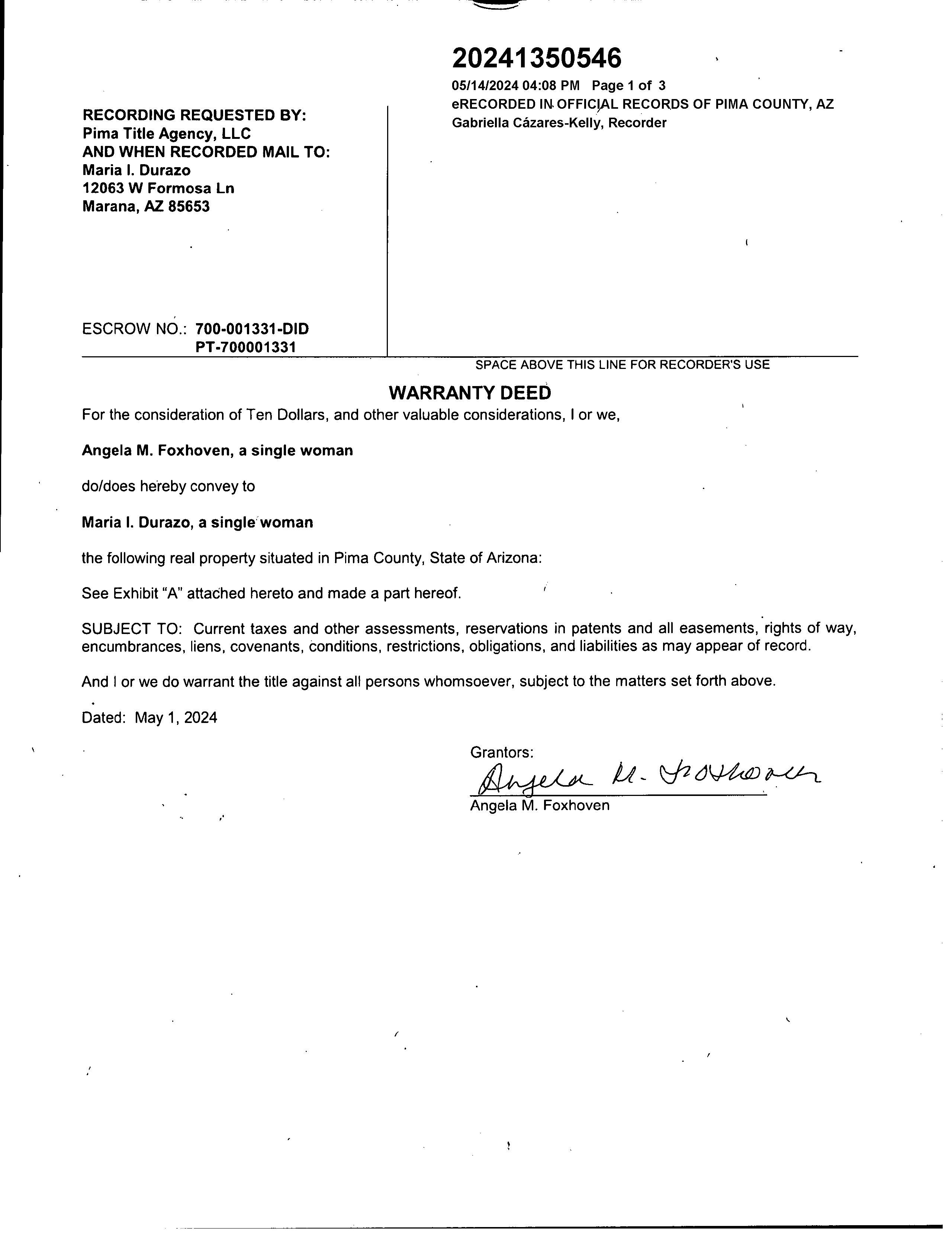 OWNER: DURAZO MARIA AFFIDAVIT 2024 1350546 05/14/2024