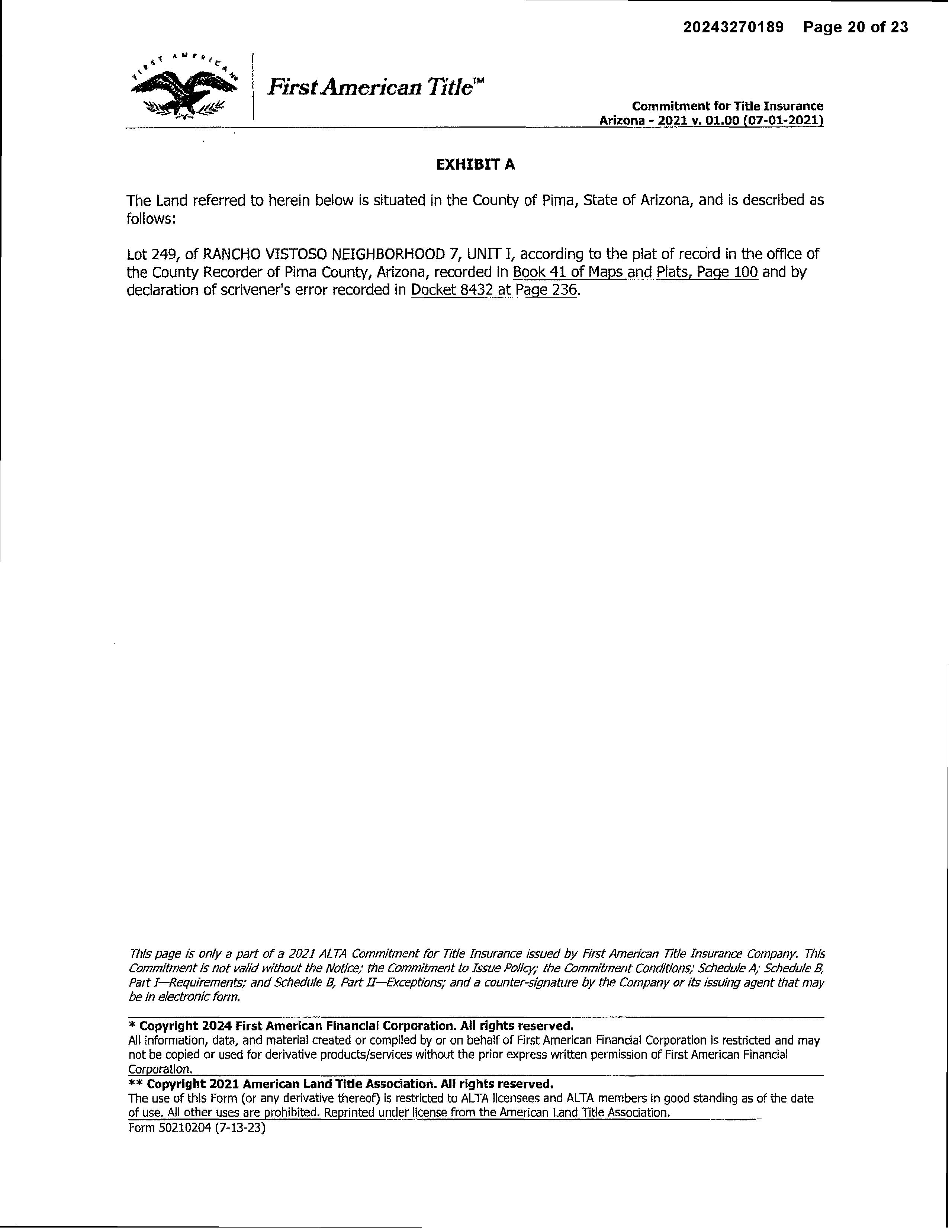 This report is not an insured product or service or a representation of the condition of title to real property. It is not an abstract, legal opinion, opinion of title, title insurance commitment or preliminary report, or any form of Title Insurance or Guaranty. This report is issued exclusively for the benefit of the Applicant therefor and may not be used or relied upon by any other person. This report may not be reproduced in any manner without First Americans prior written consent. First American does not represent or warrant that the information herein is complete or free from error, and the information herein is provided without any warranties of any kind, as-is, and with all faults. As a material part of the consideration given in exchange for the issuance of this report, recipient agrees that First Americans sole liability for any loss or damage caused by an error or omission due to inaccurate information or negligence in preparing this report shall be limited to the fee charged for the report. Recipient accepts this report with this limitation and agrees that First American would not have issued this report but for the limitation of liability described above. First American makes no representation or warranty as to the legality or propriety of recipient's use of the information herein.