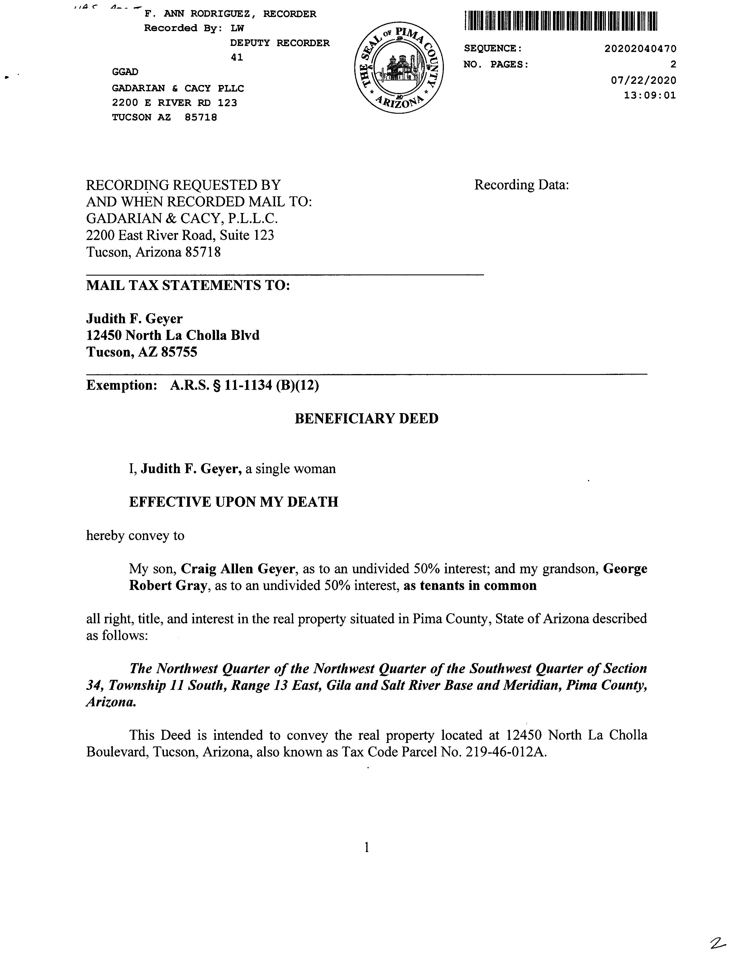 Mailing Address : 12450 N La Cholla Blvd, Tucson AZ 85755-8200 R139