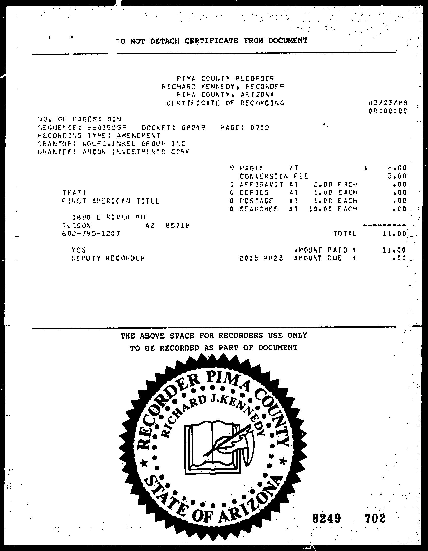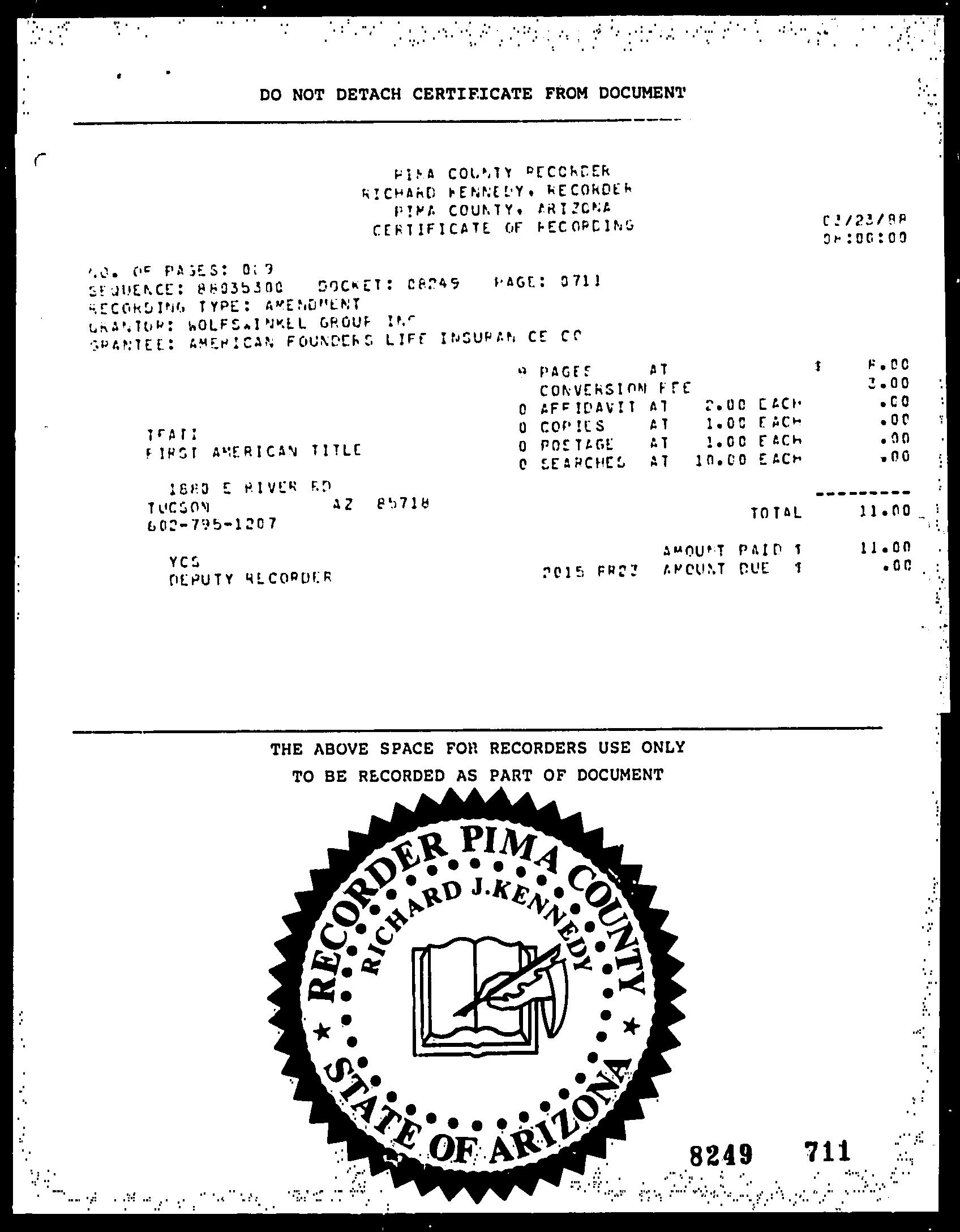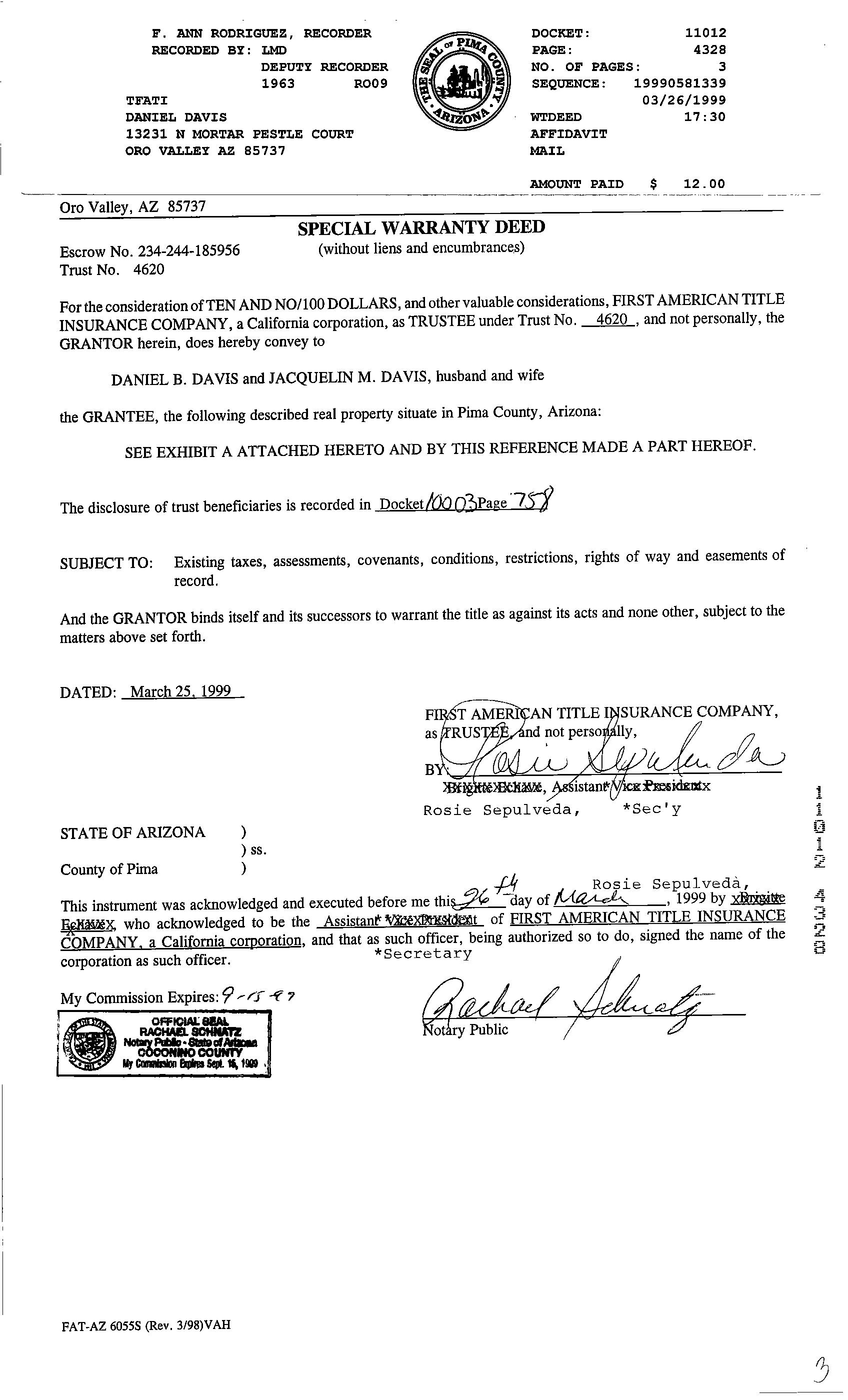 This information is furnished without fee and without benefit of a complete title search. No liability is assumed by First American Title. If it is desired that liability be assumed, you may apply for a policy of title insurance with First American Title Insurance Company.