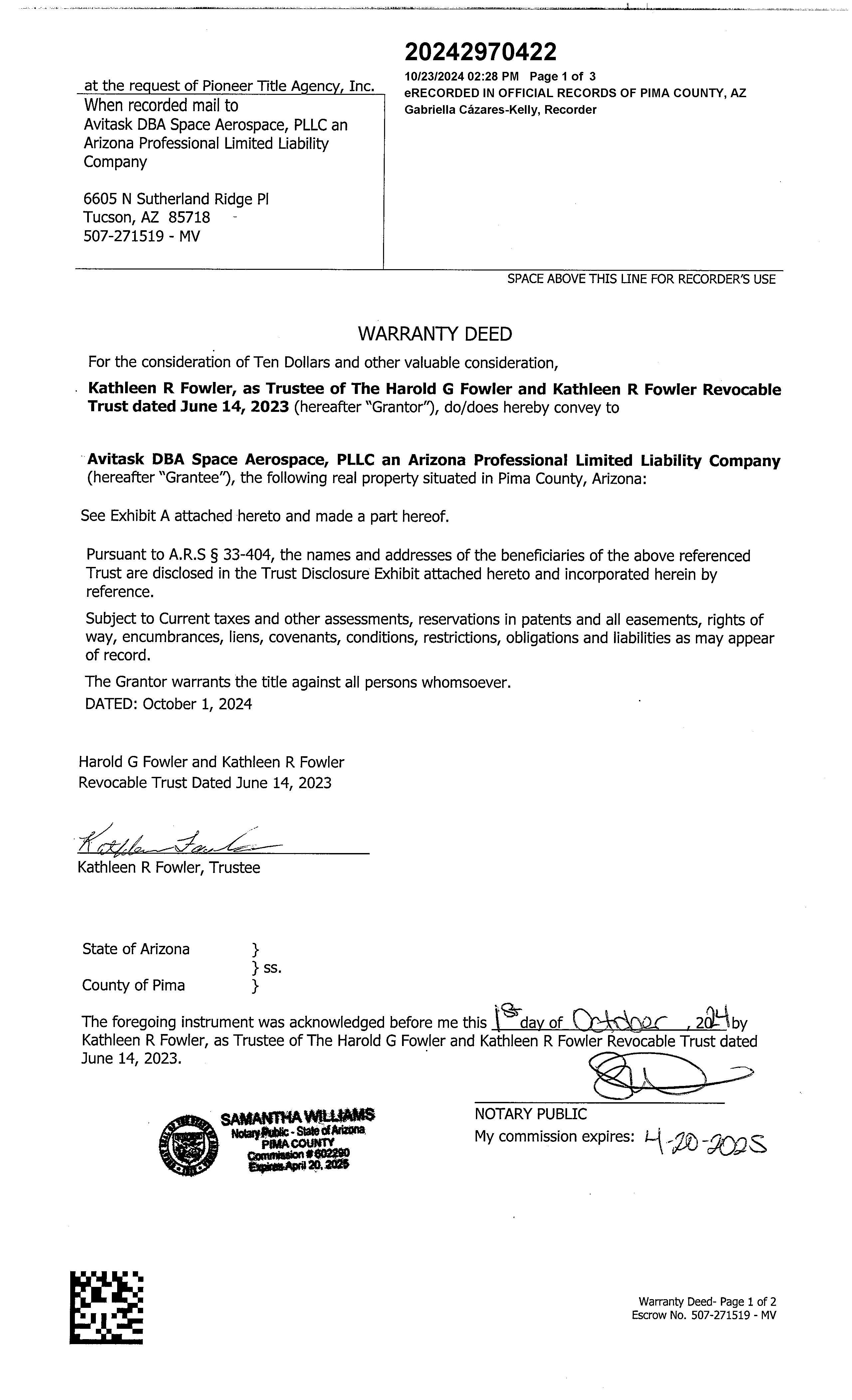 OWNER: AVITASK & SPACE AEROSPACE P AFFIDAVIT 2024 2970422 10/23/2024