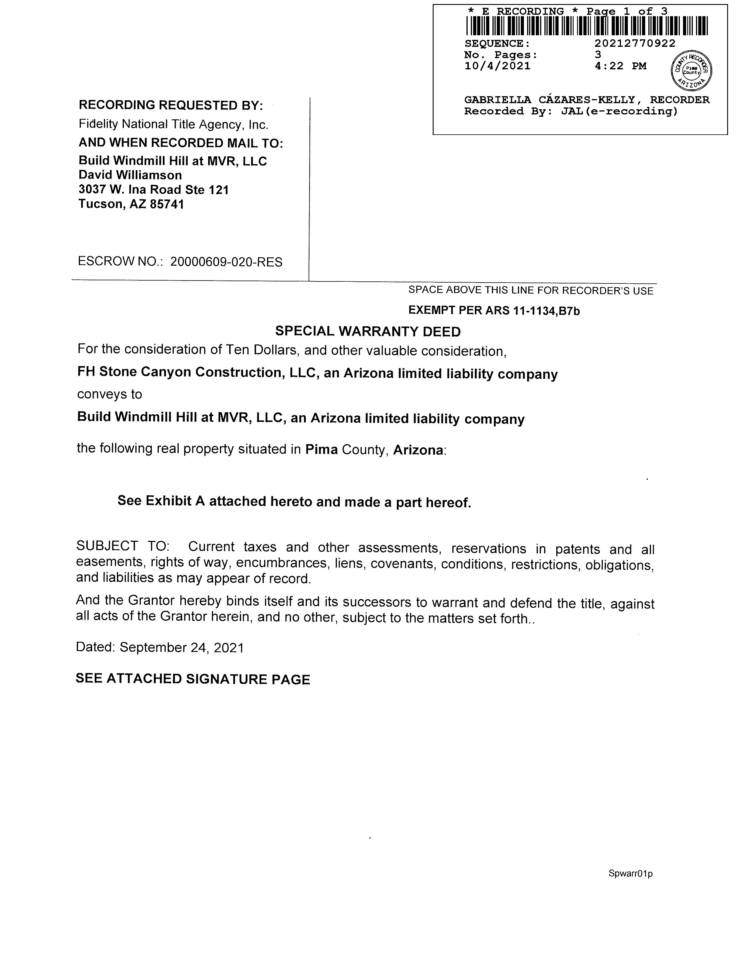 OWNER: FH STONE CANYON CONSTRUCTIO AFFIDAVIT 2021 2770921 10/04/2021