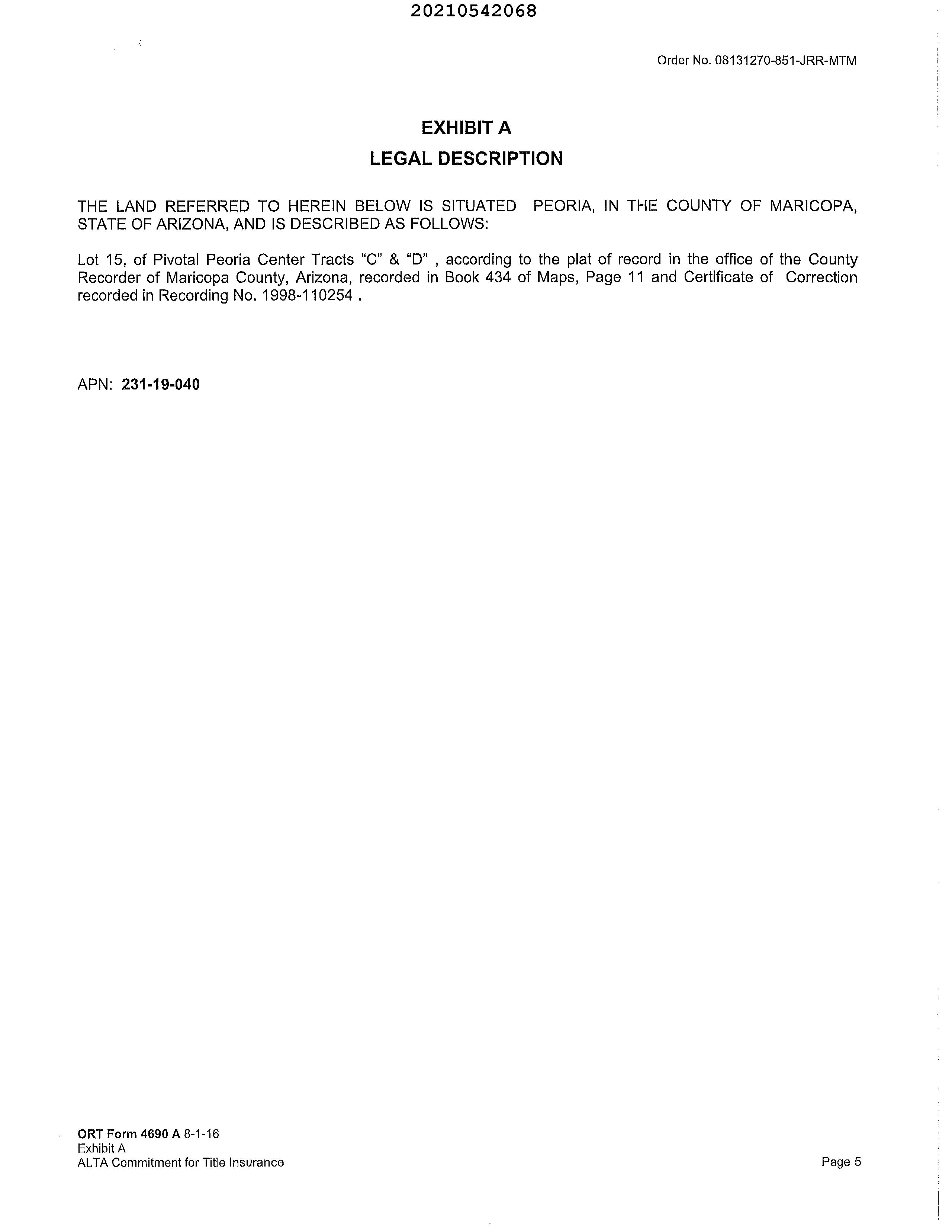 Legal Description : Lot 15 Pivotal Peoria Center Tracts C & D Mcr 434-11